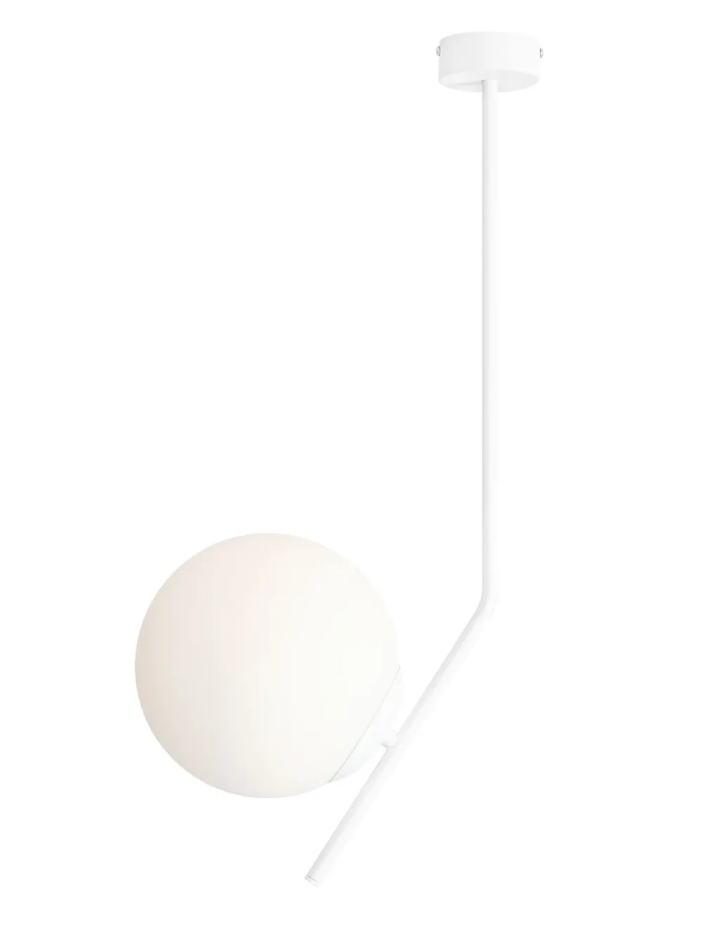 Der weiße Kugelschirm aus Glas streut das Licht blendarm – hervorragend für gemütliche Momente im Wohnzimmer und Esszimmer über dem Esstisch