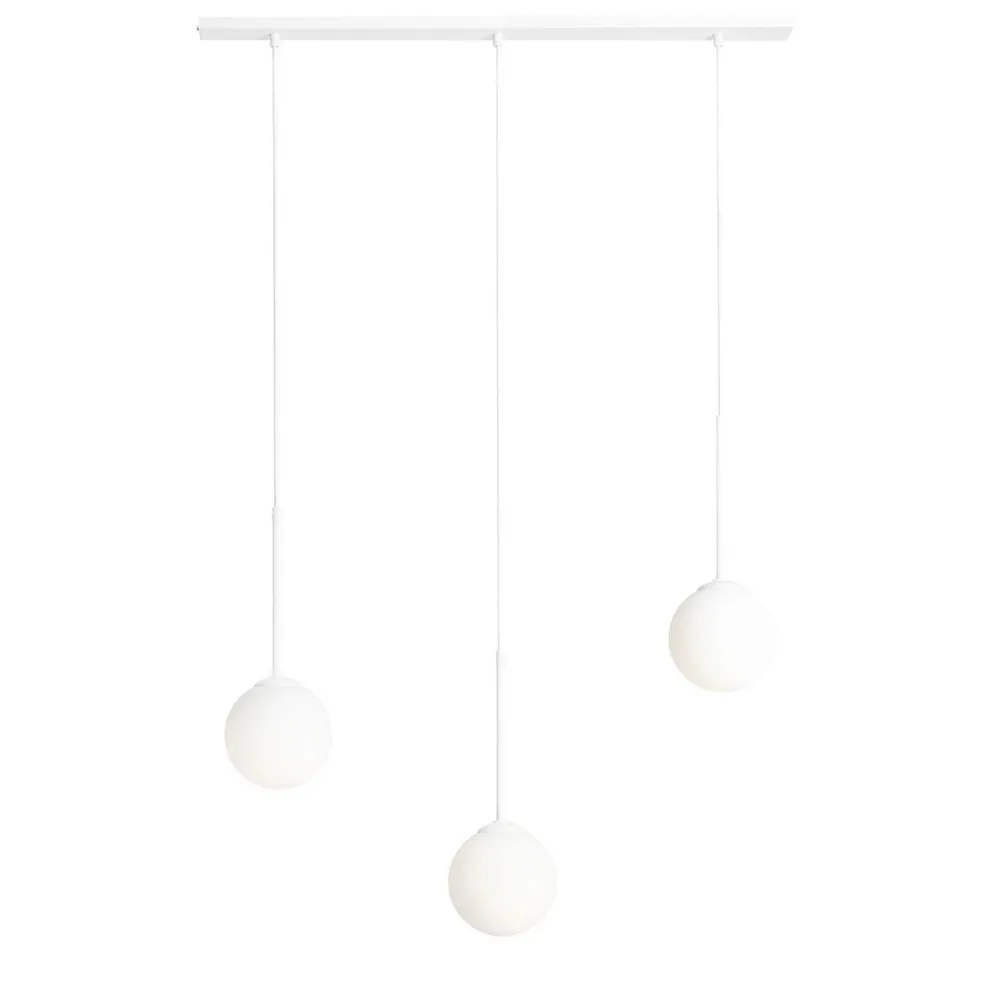 Die satinierten Kugelschirme aus Glas streuen das Licht warm und weich – ideal für ein gemütliches Ambiente über dem Esstisch in Wohnzimmer und Esszimmer