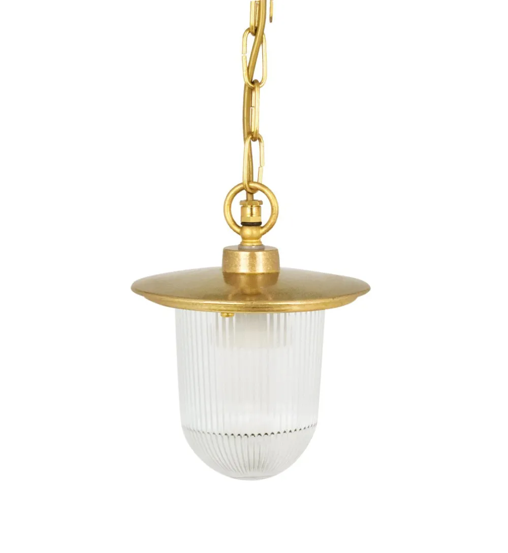 Elegante Pendelleuchte für außen aus massivem Messing und kunstvollem Riffelglas für Haustür, Eingang, Balkon, Terrasse und Veranda