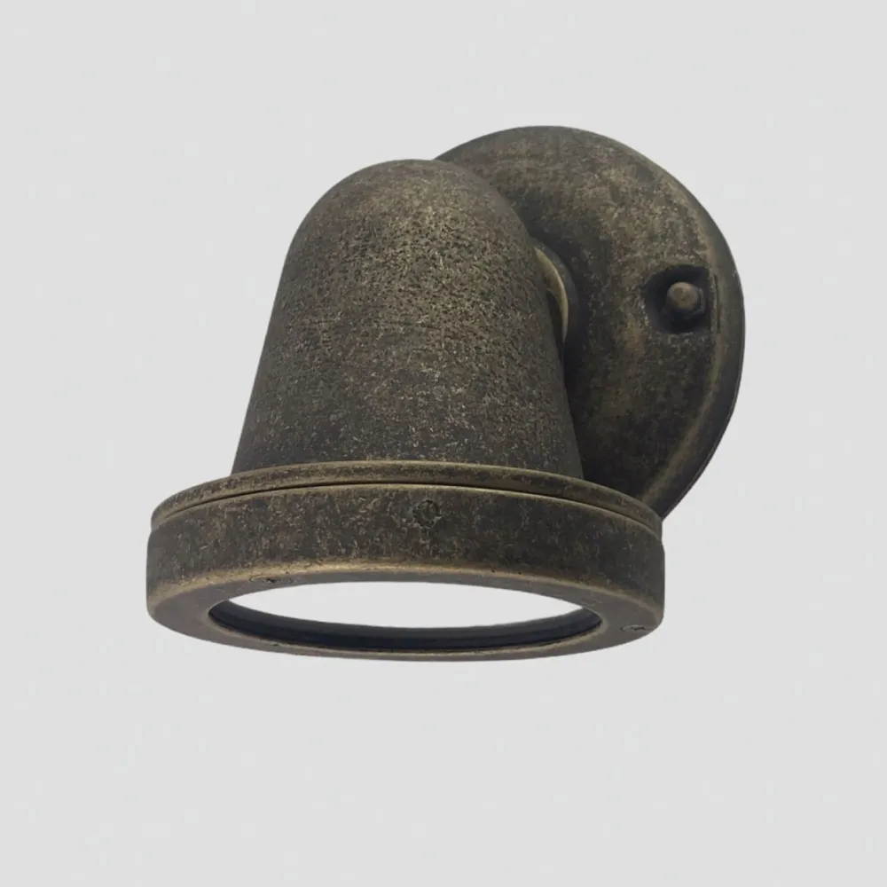 Schmale Outdoor Wandleuchte aus massivem Messing und Glas in verwittertem Messing im nostalgischen Vintage Design für Garten, Terrasse, Balkon, Haus und Hof