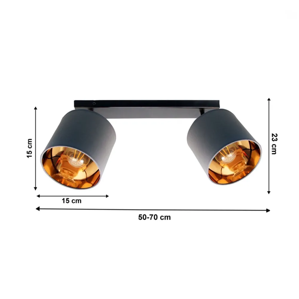 Freie Leuchtmittelwahl: Du kannst Helligkeit und Lichtfarbe mit der Wahl von passenden Leuchtmitteln individuell bestimmen | nicht inklusive Entdecke den modernen Deckenspot HAIPIS – die perfekte Kombination aus stilvollem Design und funktionaler Beleuchtung. Mit seinem eleganten Grau und den goldenen Akzenten bringt dieser Aufbaustrahler nicht nur Licht, sondern auch eine harmonische Atmosphäre in dein Zuhause. Ob im Wohnzimmer, Schlafzimmer, Flur oder Arbeitszimmer – dieser Deckenspot fügt sich nahtlos in jede Umgebung ein und setzt gezielte Lichtakzente. Die dreh- und schwenkbaren Schirme ermöglichen es dir, das Licht genau dorthin zu lenken, wo du es benötigst. Die goldene PVC-Folie auf der Innenseite sorgt für eine blendarme und gemütliche Beleuchtung, die zum Verweilen einlädt. Du hast die Freiheit, die Helligkeit und Lichtfarbe selbst zu bestimmen, indem du die passenden Leuchtmittel (2x E27 bis 60W) wählst. So kannst du die Lichtstimmung ganz nach deinen Wünschen gestalten – ideal für entspannte Abende oder produktive Arbeitsstunden. Mit einem Durchmesser von 150 mm und einer Höhe von 150 mm ist der HAIPIS Deckenspot nicht nur kompakt, sondern auch äußerst funktional. Die IP20-Klassifizierung macht ihn zur idealen Innenleuchte, während das hochwertige Metall und der Stoff für Langlebigkeit und Stil sorgen. Egal, ob du nach Wohnzimmerlampen modern, Deckenstrahlern für den Flur oder stilvollen Bürolampen suchst – dieser Deckenspot erfüllt all deine Anforderungen. Fazit: Der HAIPIS Deckenspot vereint modernes Design mit praktischen Funktionen und ist die ideale Wahl für alle, die Wert auf Qualität und Stil legen. Lass dich von der Flexibilität und der eleganten Ausstrahlung dieses Aufbaustrahlers begeistern und bringe Licht in dein Zuhause!