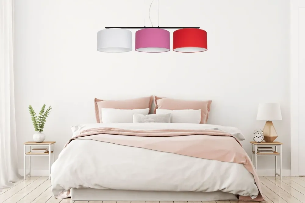 Die verschiedenfarbigen Stoffschirme sind dekorativ und streuen das Licht diffus und blendarm in den Raum