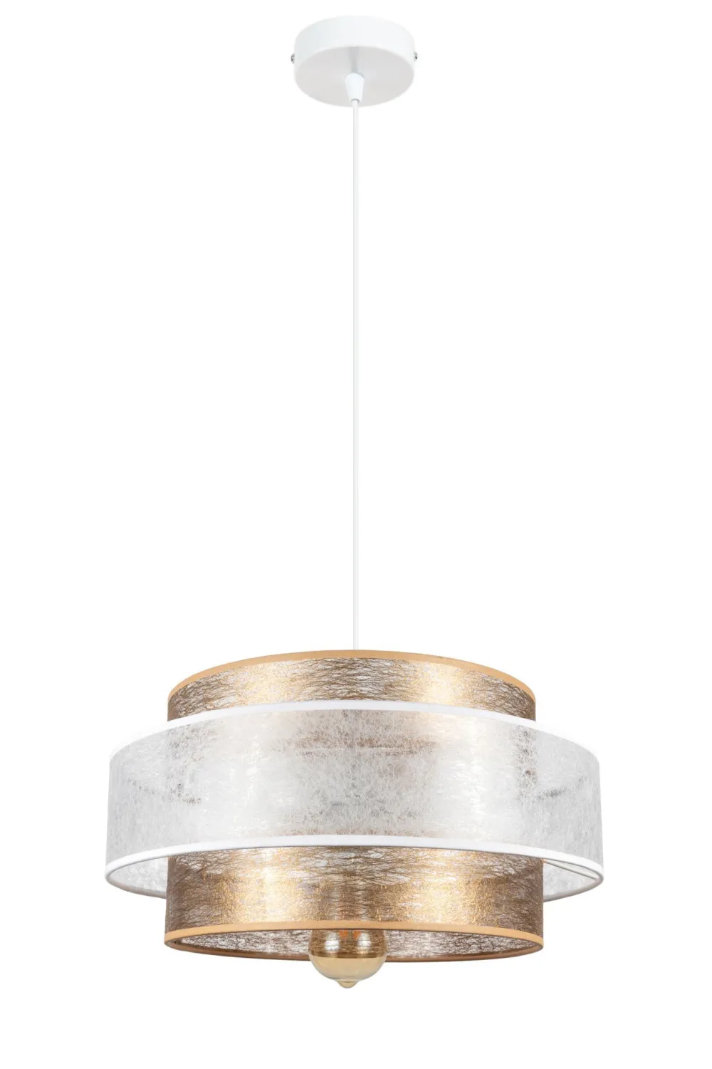 Moderne Pendelleuchte aus Metall und Stoff in Weiß und Gold