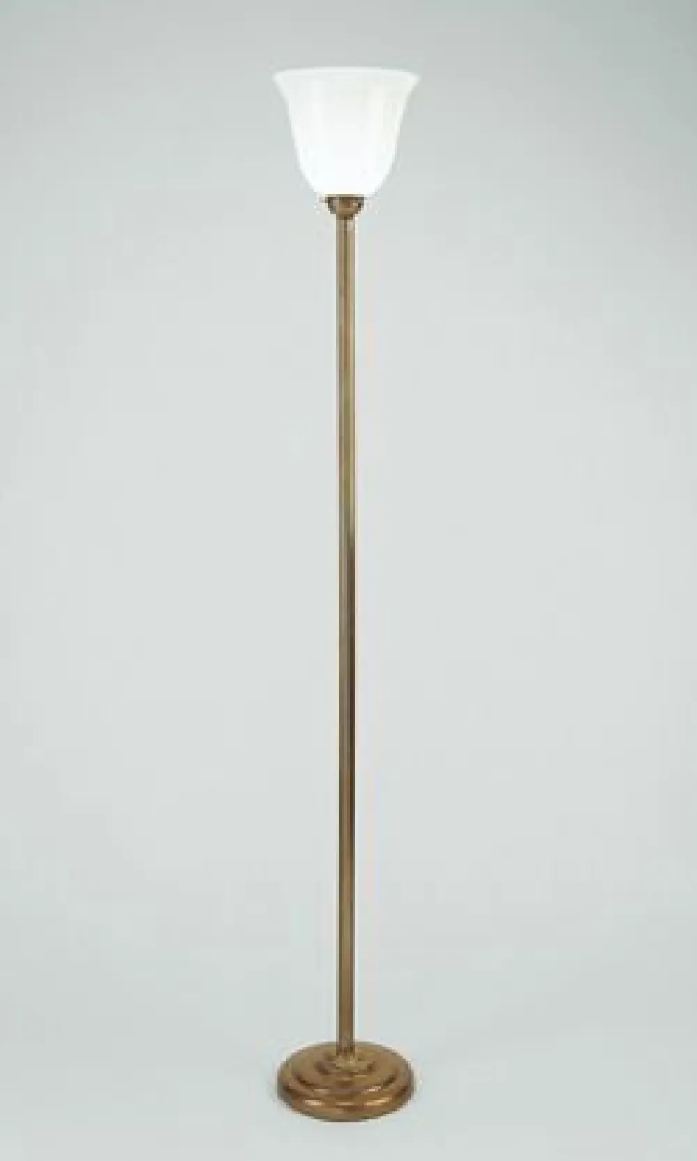 Der geweißte Glasschirm streut das Licht blendarm für ein gemütliches Ambientelicht neben der Couch im Wohnzimmer