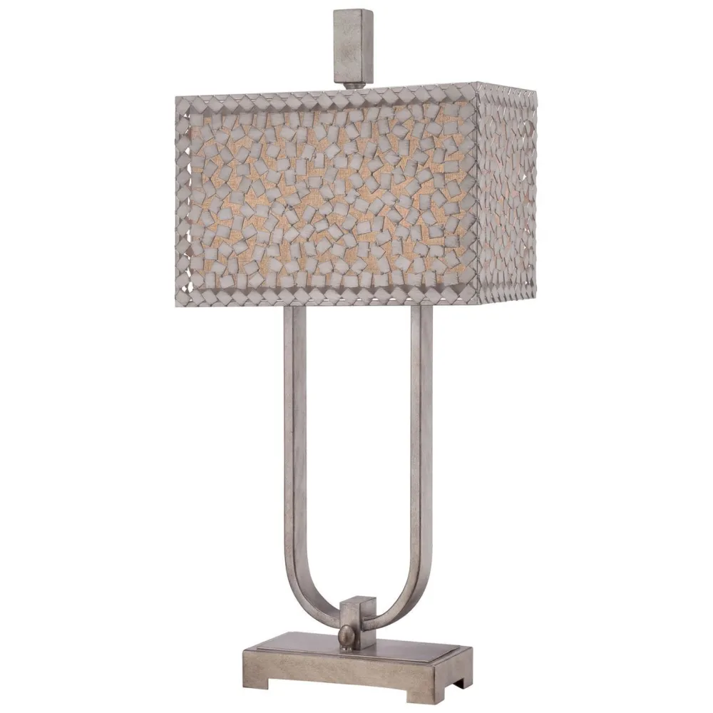 Kleine Plättchen in Silber antik bilden einen zweiten Schirm, der die Tischlampe zu einem wahren Hingucker macht