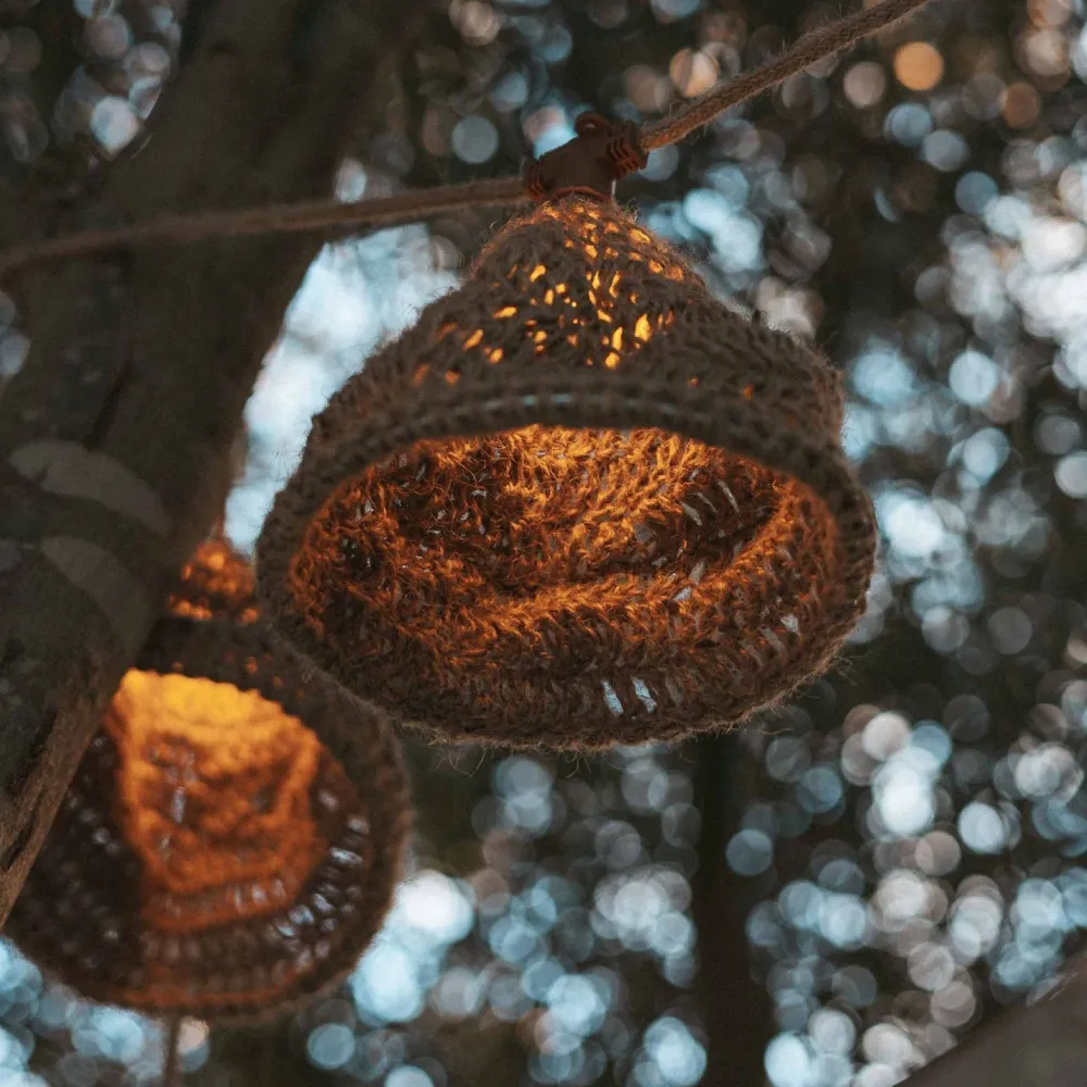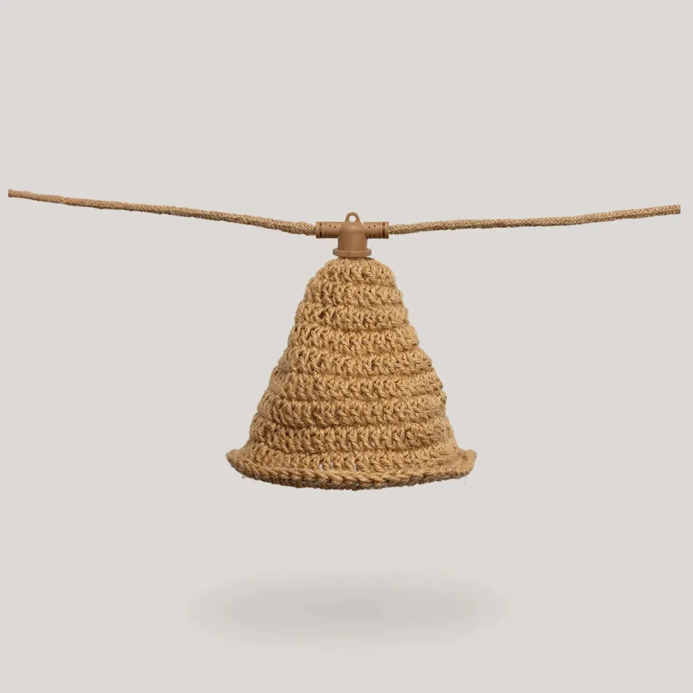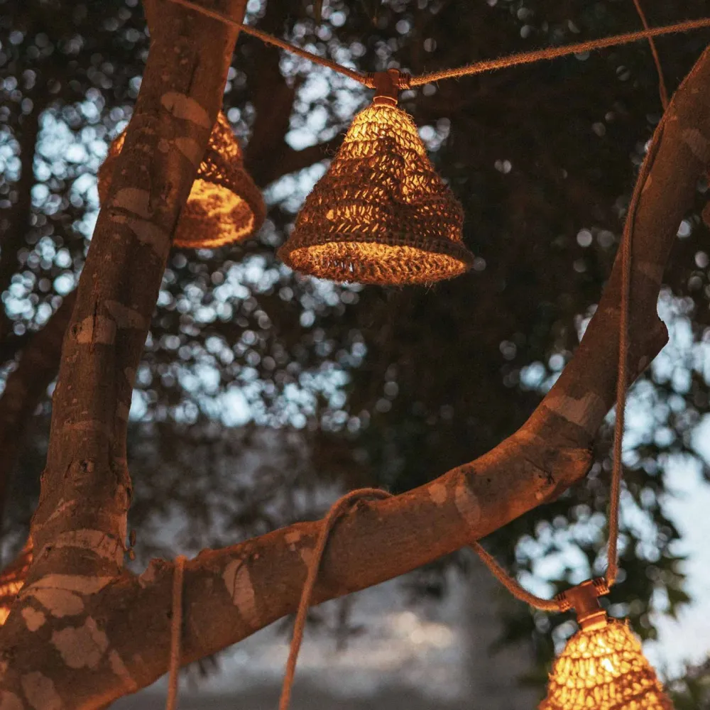 Multifunktionale Außenlichterkette mit dekorativen Lampenschirmen aus geflochtener Jute