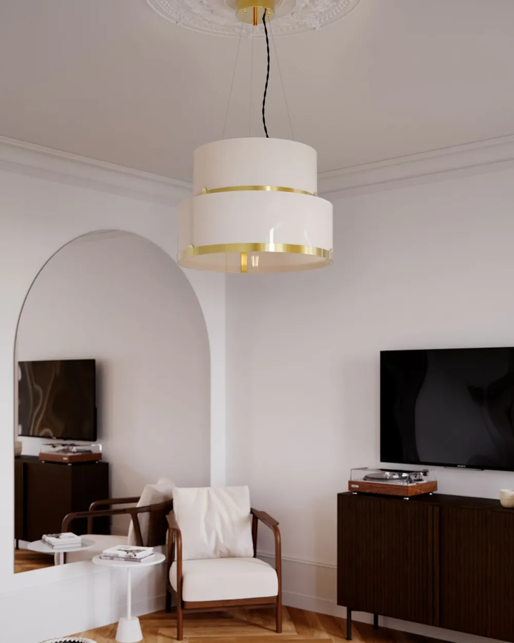 Die glänzenden Farben Messing und Weiß unterstreichen den außergewöhnlichen Look und setzen einen stilvollen Akzent an jeder Decke