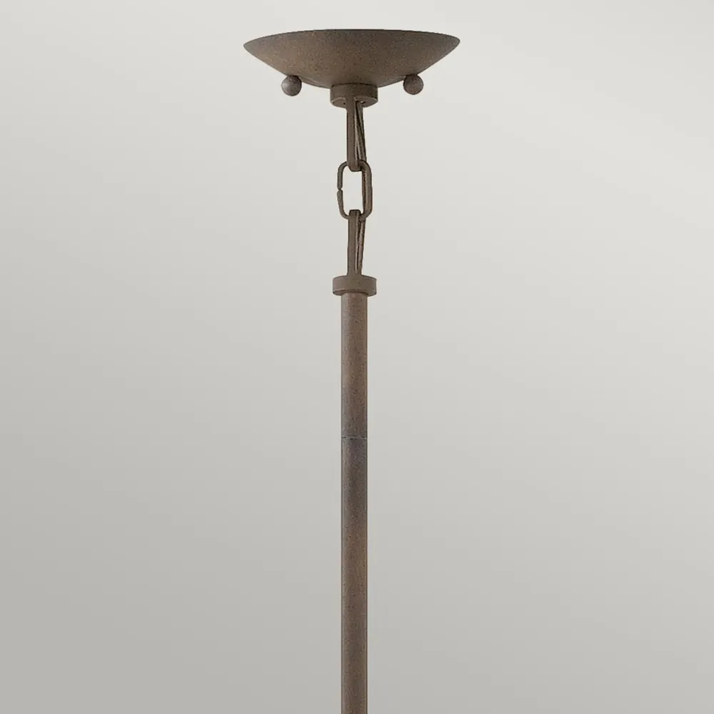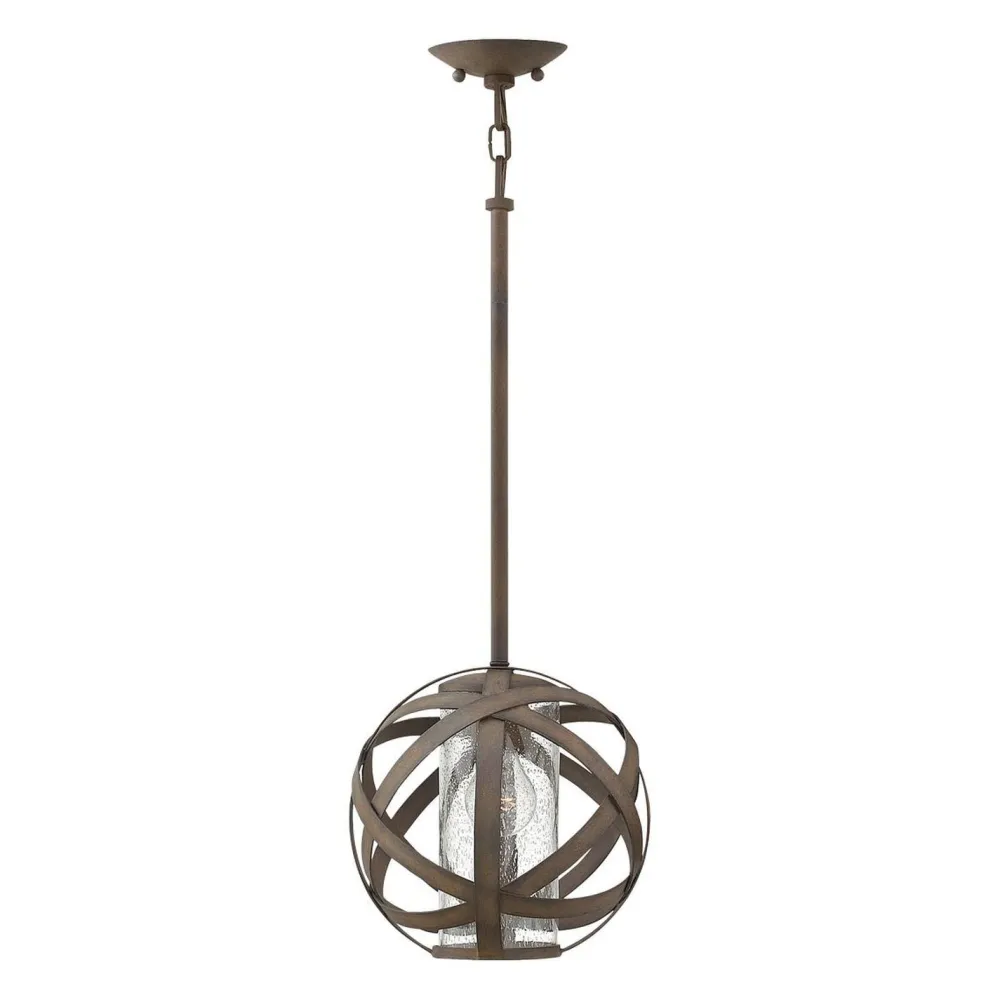 Der Kugelschirm in antiker Eisenoptik umrahmt den inneren Glasschirm und macht die Pendelleuchte zu einem absoluten Hingucker