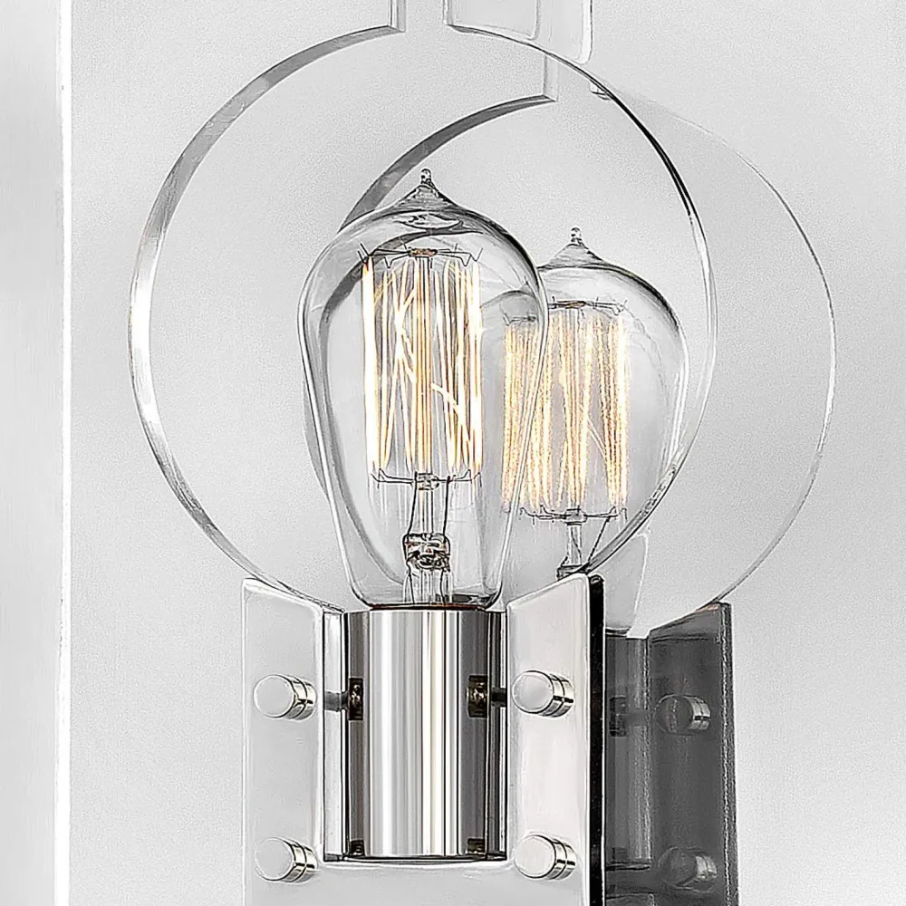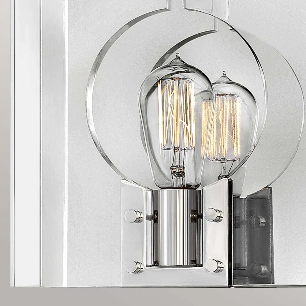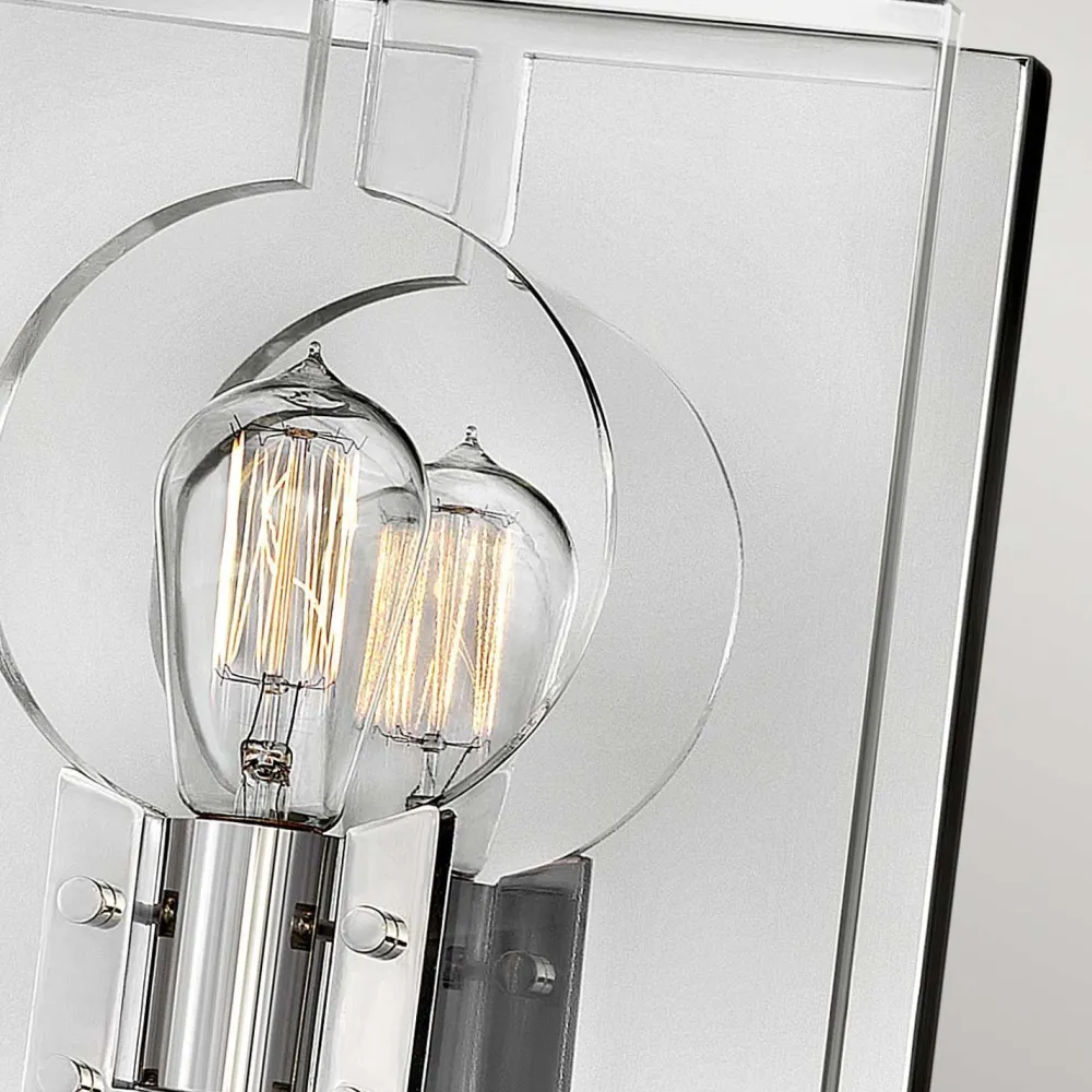 Der eckige Rahmen in spiegelndem Nickel setzt einen spannenden Kontrast zur runden Licht-Öffnung, was aus der Wandleuchte einen dekorativen Blickfang in Wohnzimmer und Flur macht