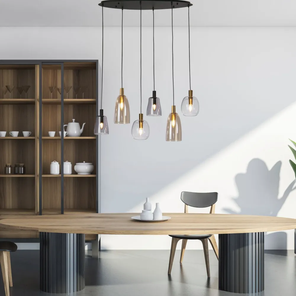 Große Pendelleuchte mit bunten Lampenschirmen aus Rauchglas