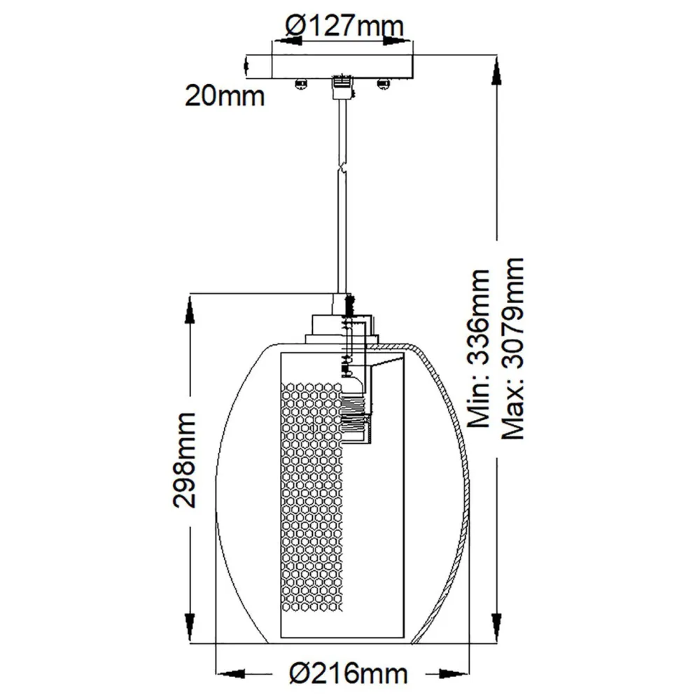 | Maße: | Breite: 216 mm | Hängetiefe: 336-3079 mm | Länge: 216 mm | Durchmesser: 216 mm | Höhe Schirm: 298 mm | Kabellänge: 2896 mm |