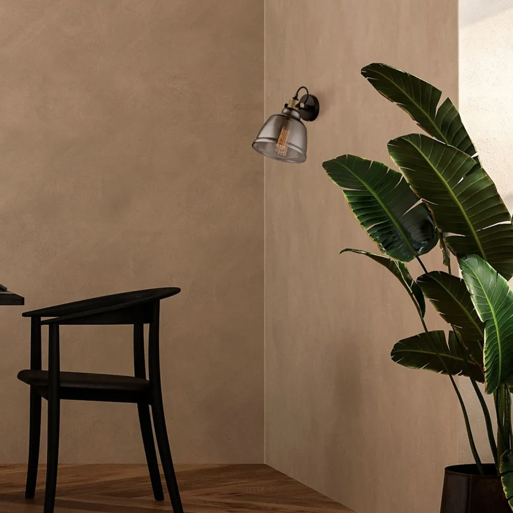 Der Lampenschirm aus Rauchglas verleiht der Wandlampe einen außergewöhnlichen Look und macht sie zu einem dekorativen Blickfang in Wohnzimmer, Küche und Büro