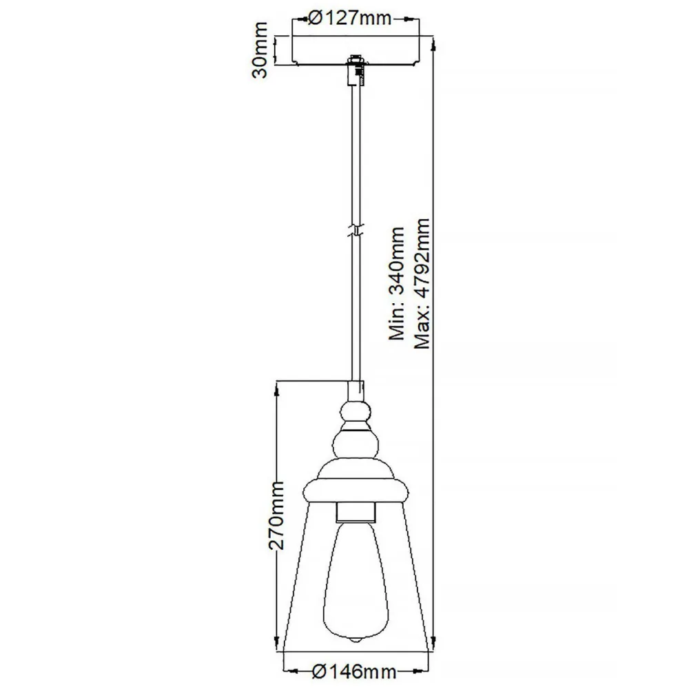 | Maße: | Breite: 146 mm | Hängetiefe: 340-4792 mm | Länge: 146 mm | Durchmesser: 146 mm | Höhe Schirm: 270 mm | Kabellänge: 4572 mm |