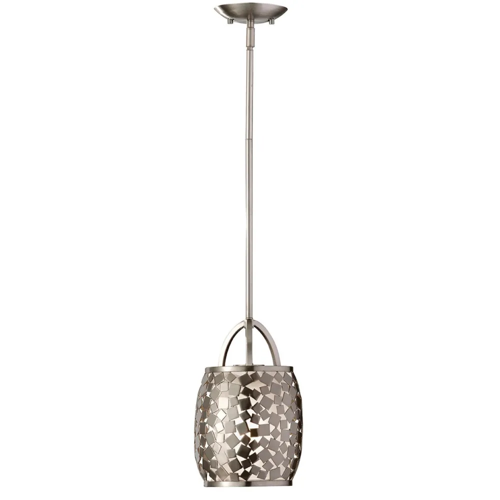 Kleine Plättchen in gebürstetem Edelstahl bilden einen zweiten Schirm, der die Deckenlampe zu einem Hingucker macht