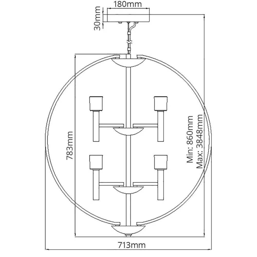 | Maße: | Breite: 713 mm | Hängetiefe: 860-3848 mm | Länge: 713 mm | Durchmesser: 713 mm | Höhe Schirm: 783 mm | Kabellänge: 3048 mm |