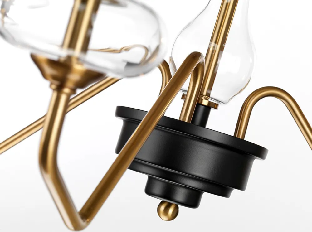 Die gebogenen Arme und die bauchigen Lampenschirme verleihen der Pendelleuchte einen eleganten Look, was durch die edlen Farben weiter betont wird