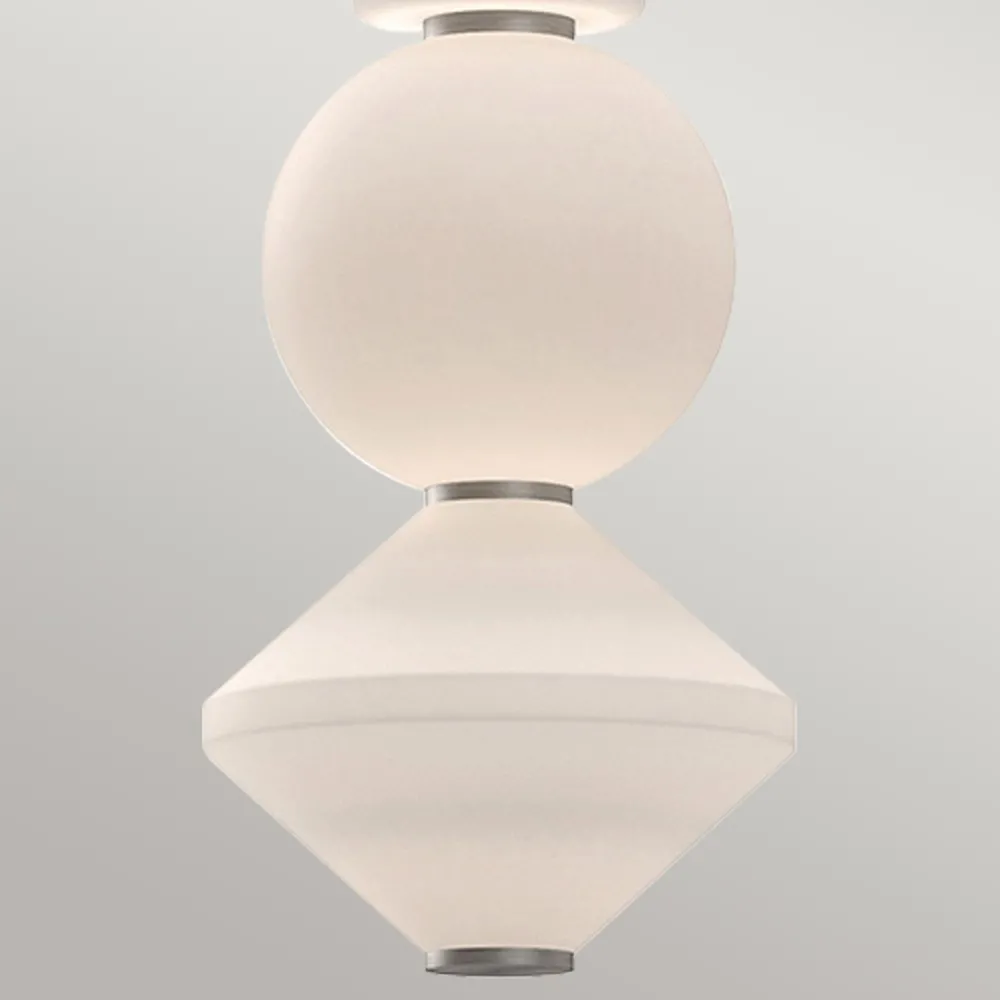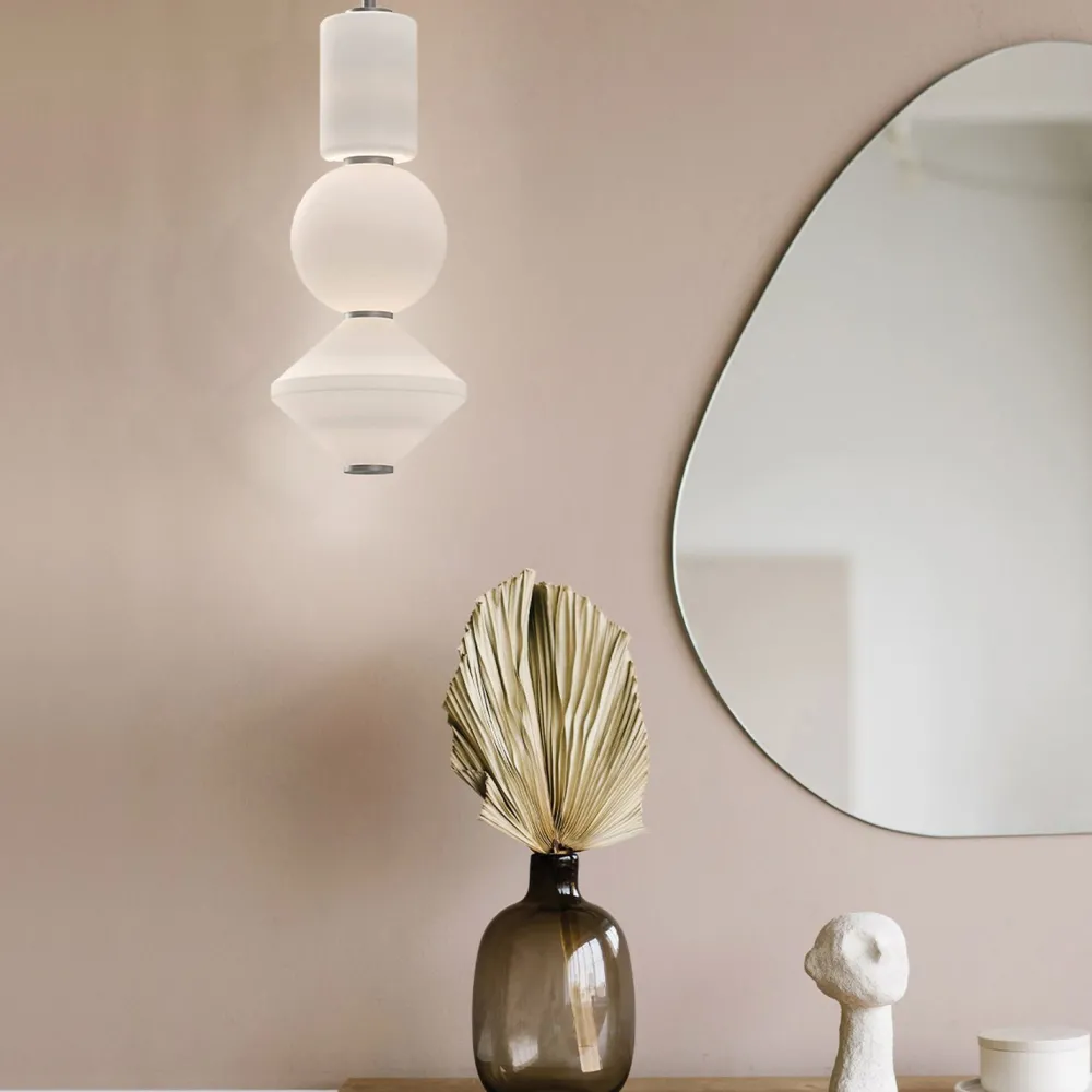 Der Schirm erinnert an aufeinandergestapelte Glasperlen im geometrischen Design – ein kunstvoller Blickfang in jedem Raum