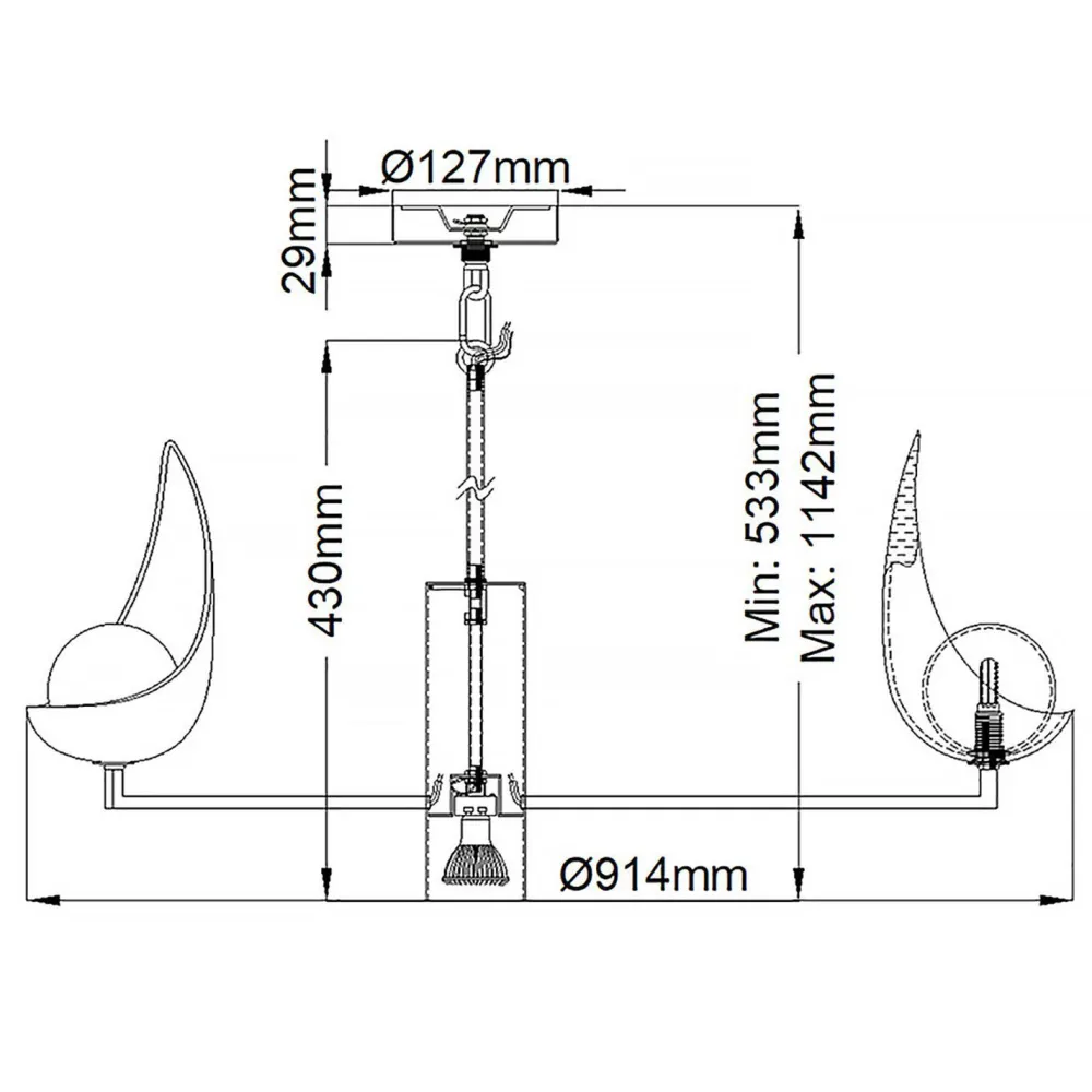 | Maße: | Breite: 914 mm | Hängetiefe: 533-1142 mm | Länge: 914 mm | Höhe Schirm: 430 mm |
