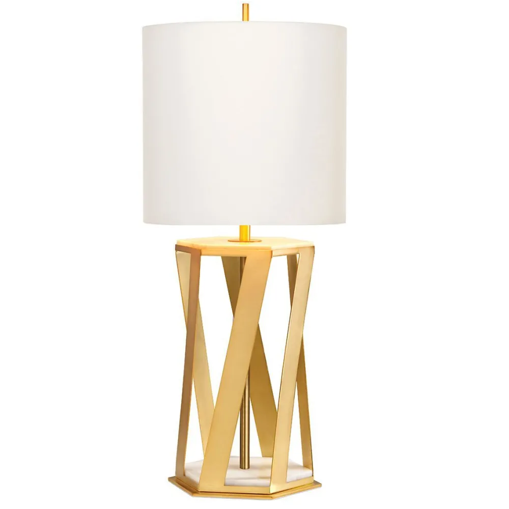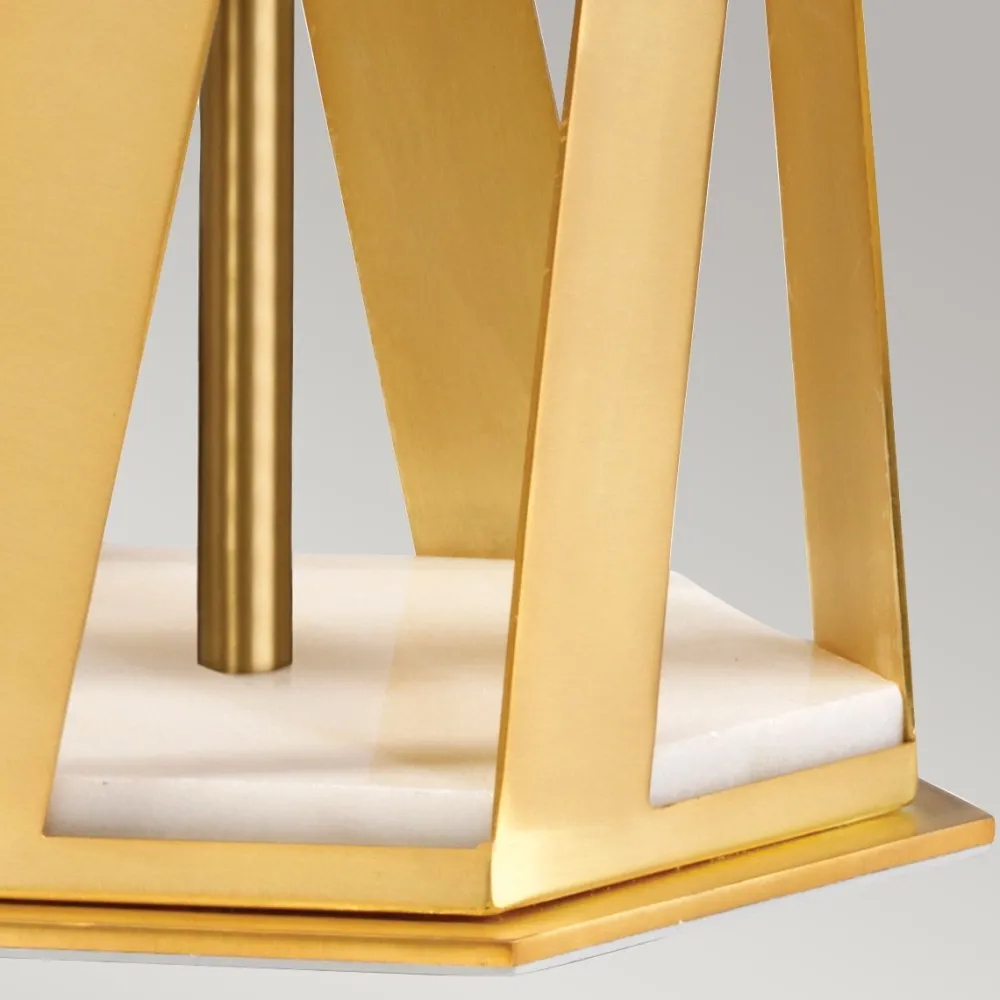 Der 6-eckige Körper in Gold ist offen gestaltet und gibt den Blick auf den edlen Marmorfuß preis