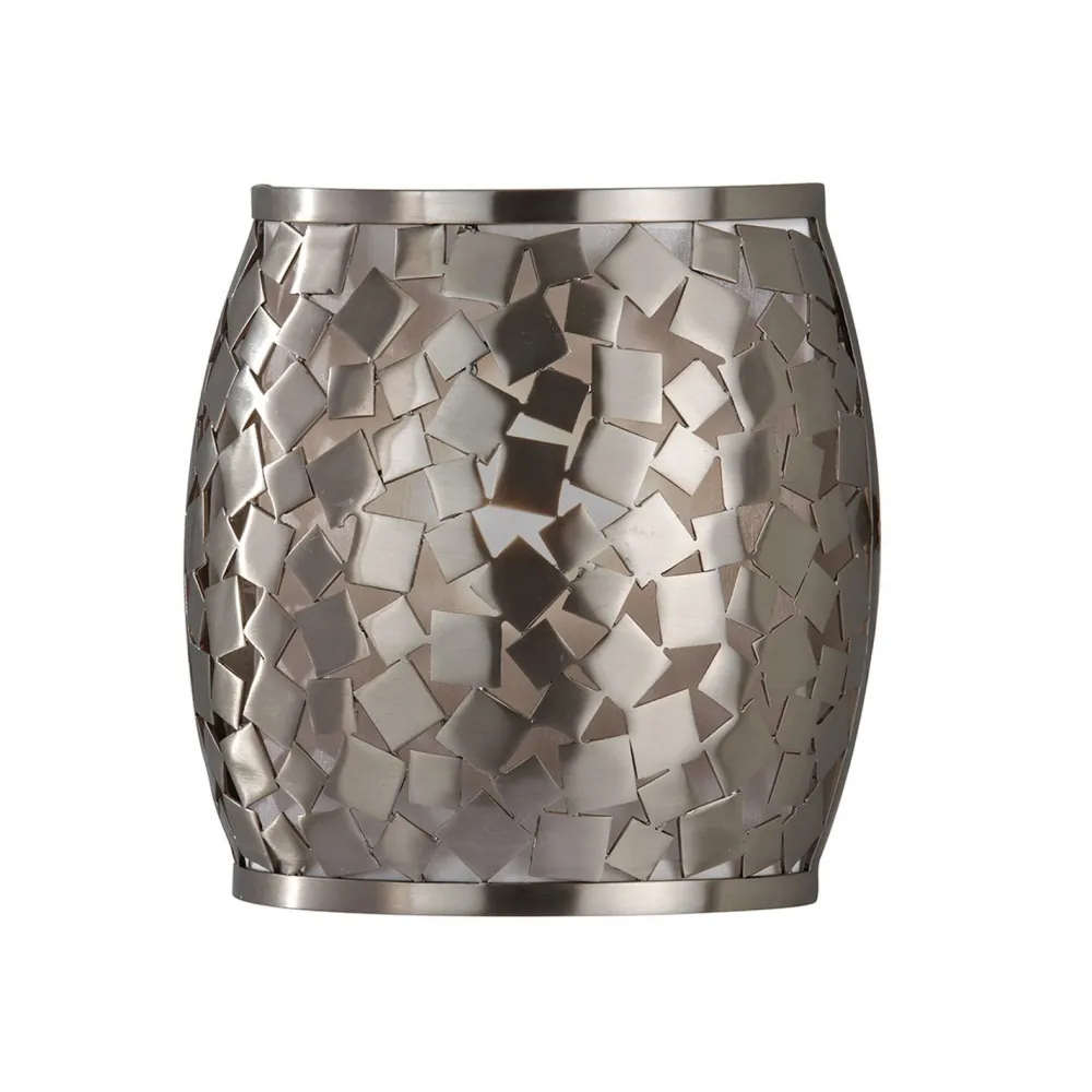 Kleine Plättchen in gebürstetem Edelstahl bilden einen zweiten Schirm, der die Deckenlampe zu einem Hingucker macht