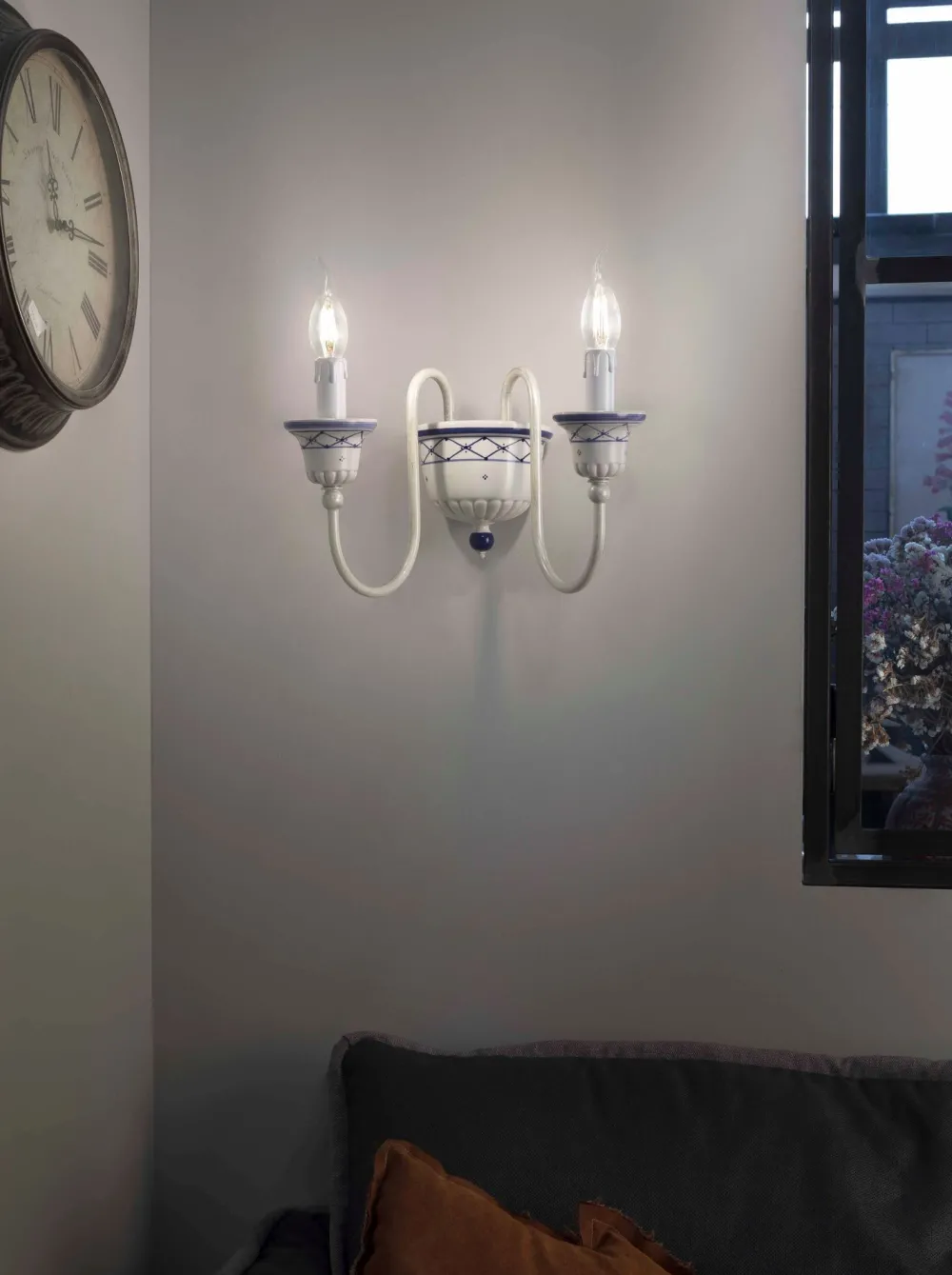 Das von Hand gemalte Dekor unterstreicht den Vintage Look und verleiht der Wandlampe einen wohnlichen Look