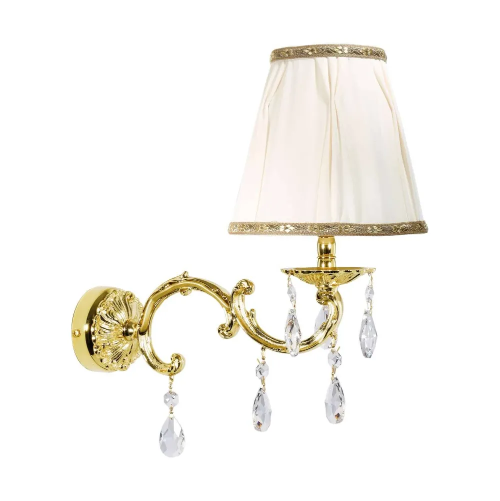 Klassische Wandleuchte aus Messing mit Stoffschirm und Glaskristallen