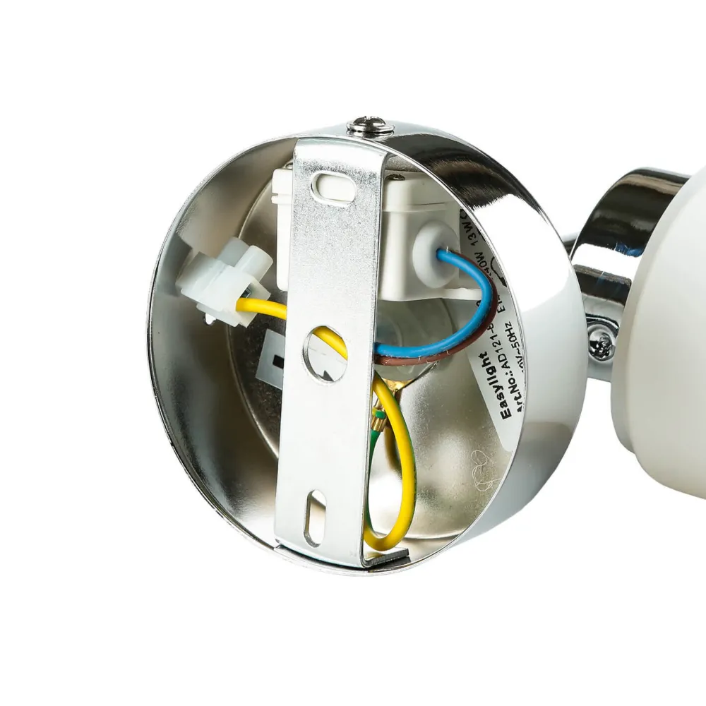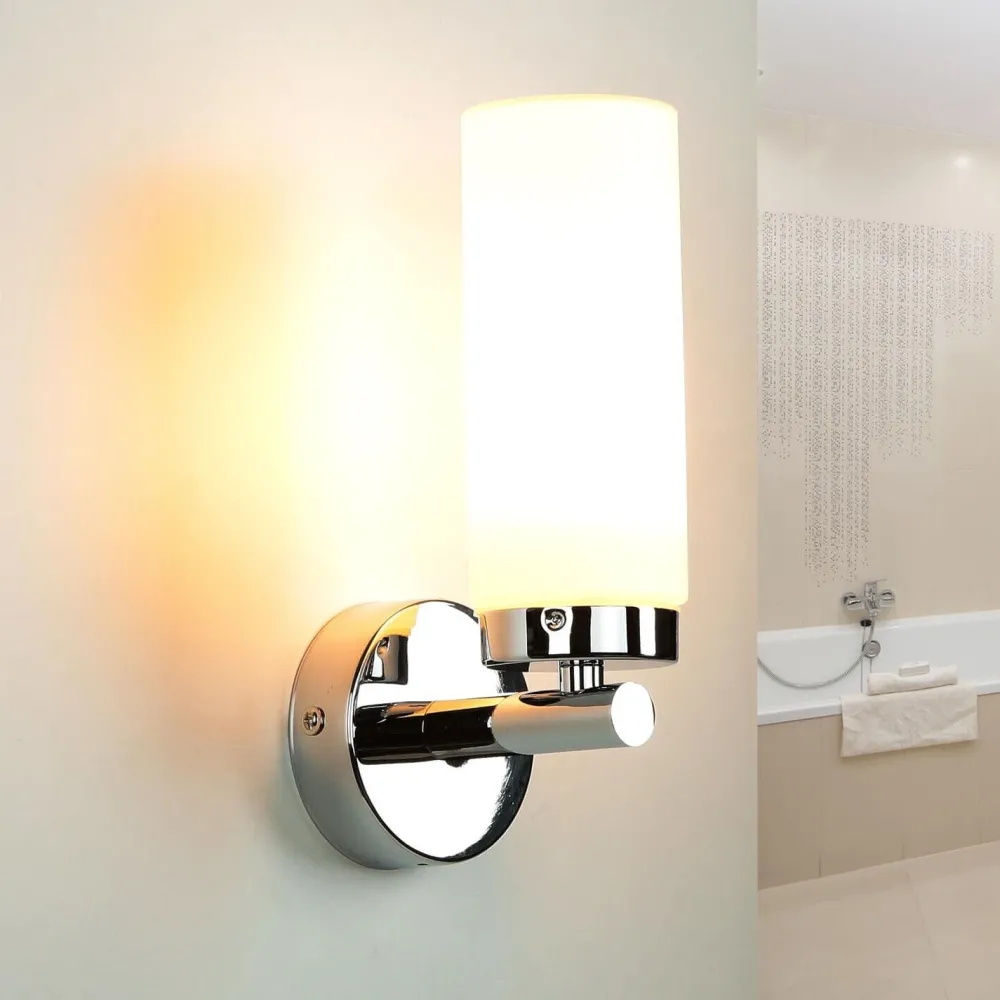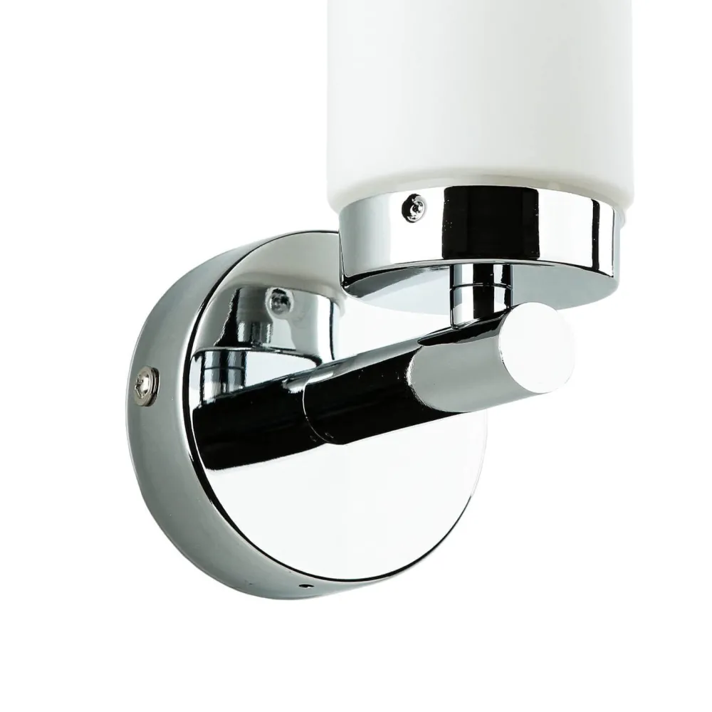 Die klassischen Farben Weiß und Chrom machen die kleine Wandleuchte zu einem vielseitigen Lichtspender neben jedem Spiegel