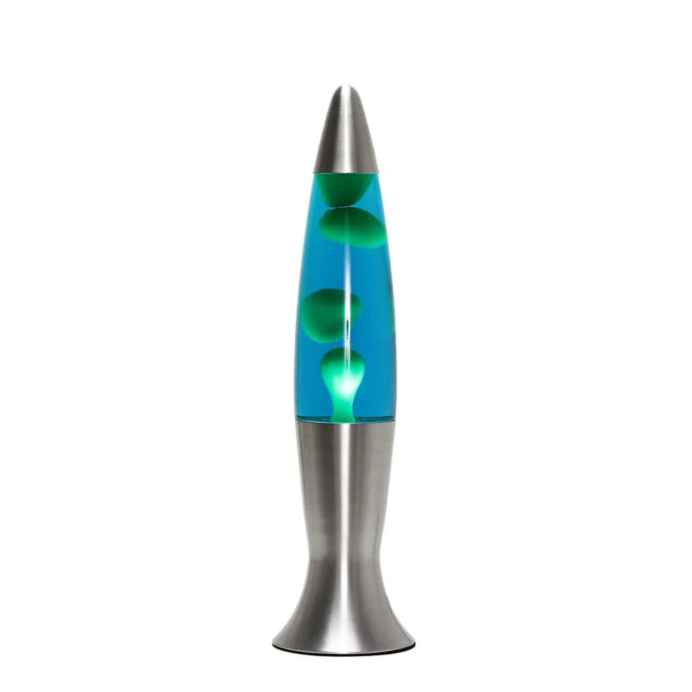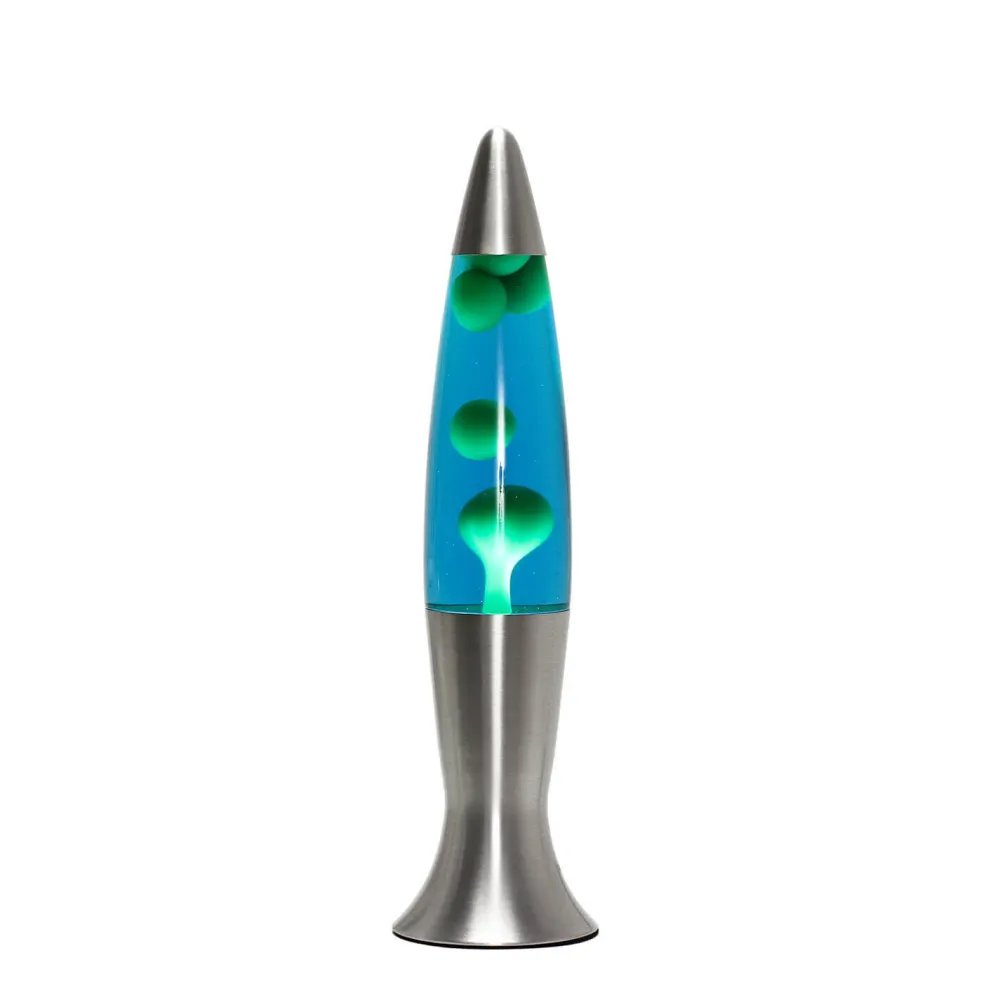 Die dekorative Tischleuchte strahlt dank dem Auf- und Absteigen der grünen Wachs-Blasen in blauer Flüssigkeit eine beruhigende Wirkung aus.