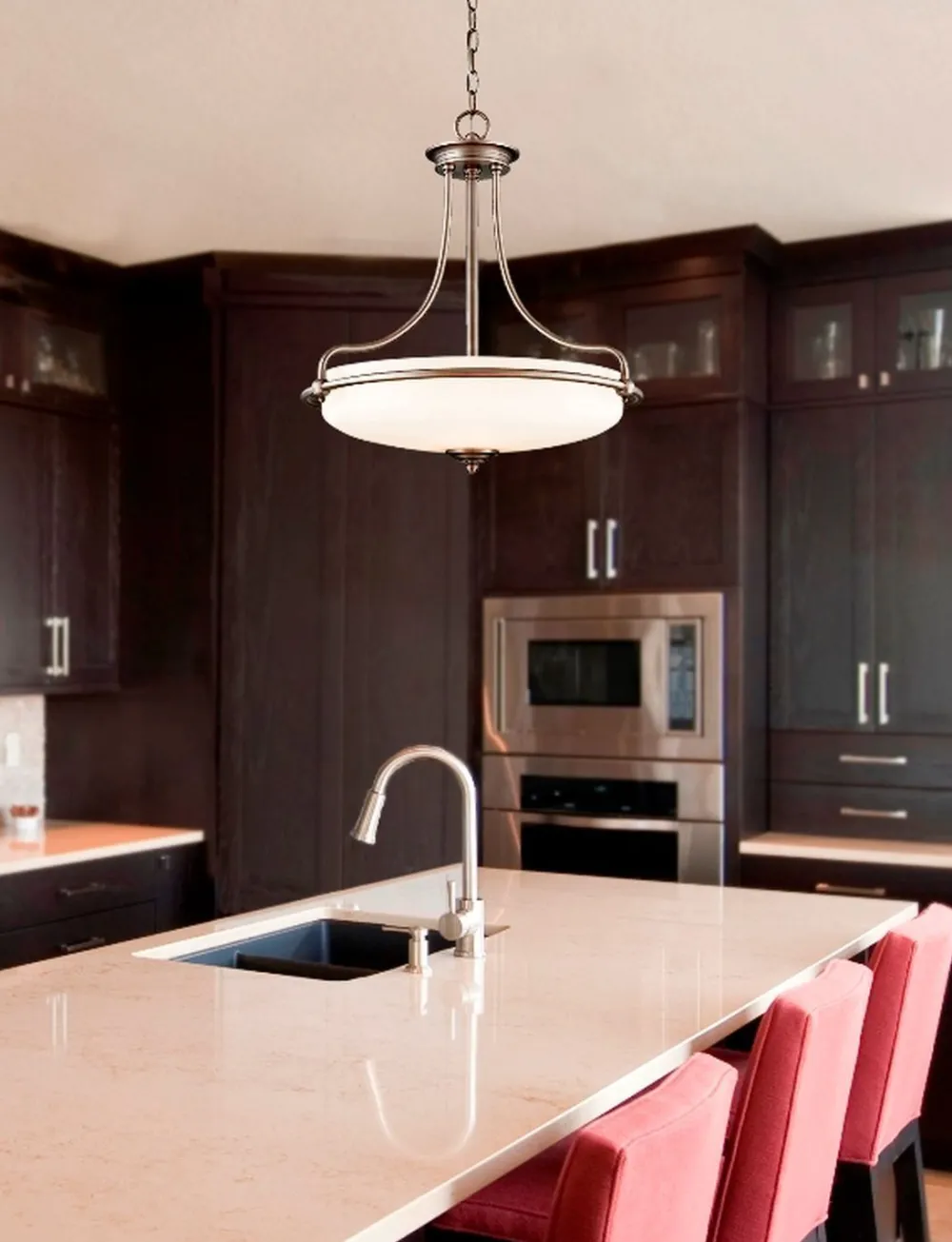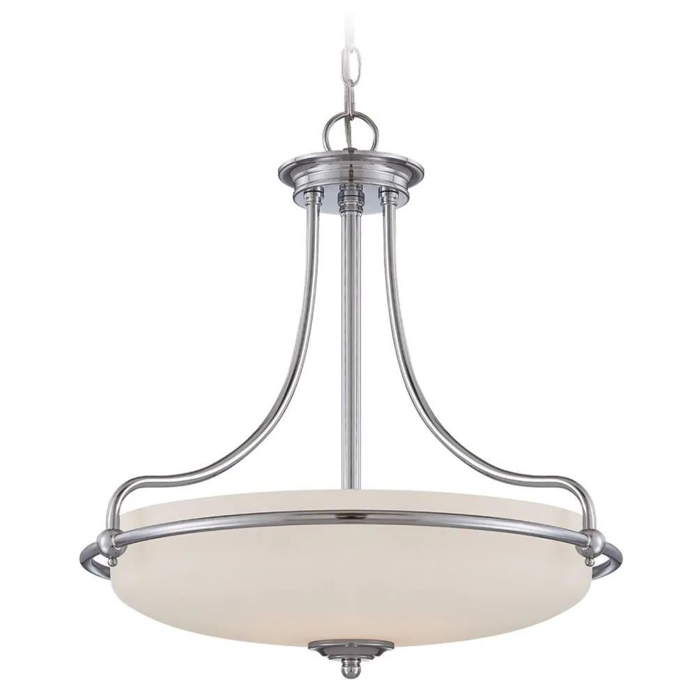 Das Licht wird durch den satinierten Glas Schirm blendarm gestreut und sorgt für eine angenehme Beleuchtung – ideal über dem Esstisch, im Wohnzimmer oder der Galerie
