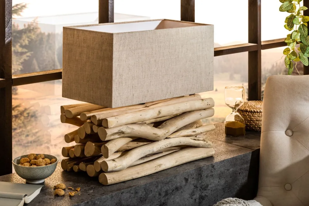 Unikat: Unterschiedlich dicke Holz-Äste bilden den Fuß der Tischleuchte und mache sie zu einem absoluten Blickfang.