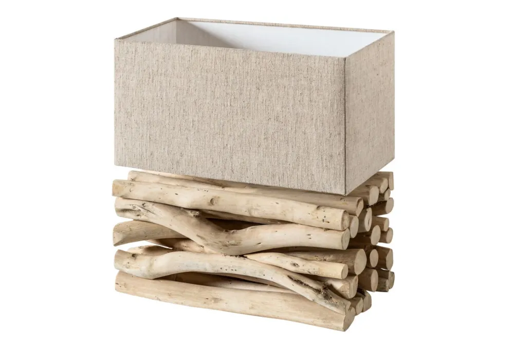 Die dekorative Tischlampe für Wohnzimmer und Schlafzimmer ist ein handgefertigtes Unikat aus Treibholz und Leinen