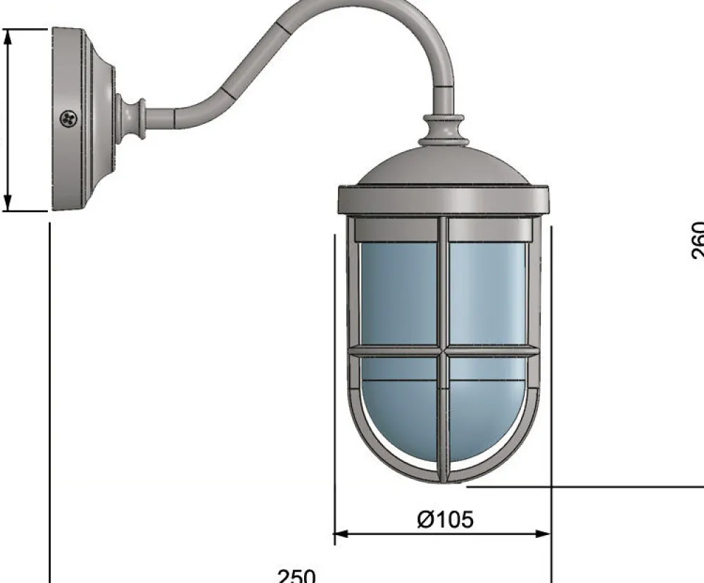 | Maße: | Breite: 105 mm | Höhe: 260 mm | Tiefe: 250 mm | Durchmesser Schirm: 105 mm | Durchmesser Sockel/Wandhalterung: 91 mm |