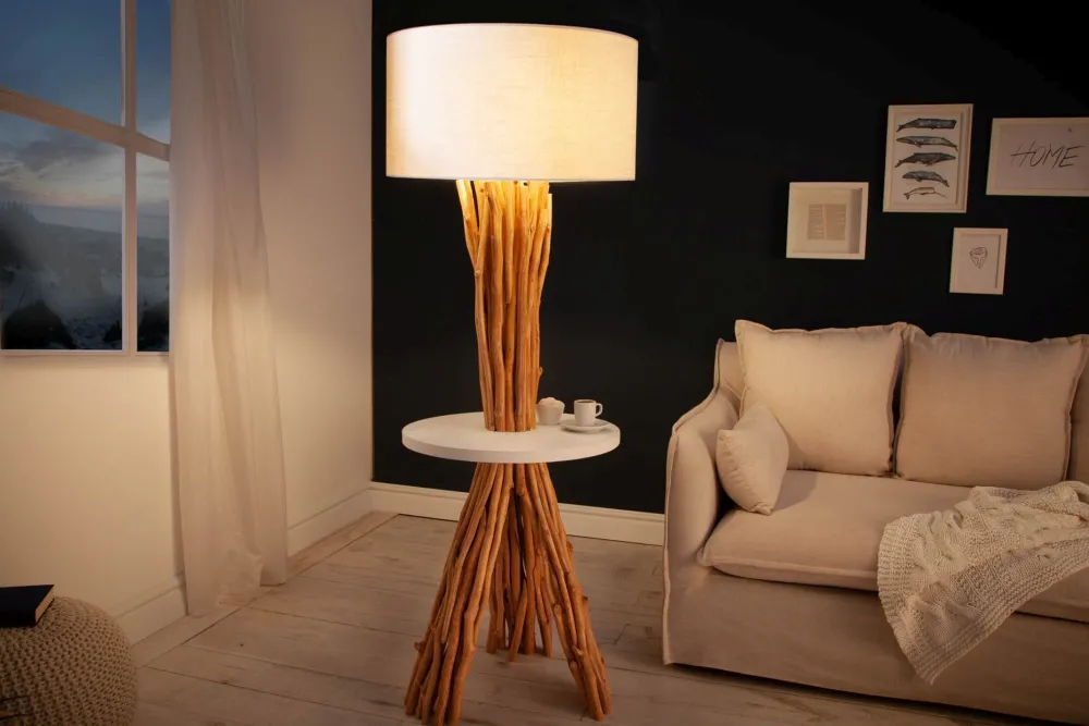 Natürliche Stehleuchte aus Massivholz und Leinen in Natur und Weiß