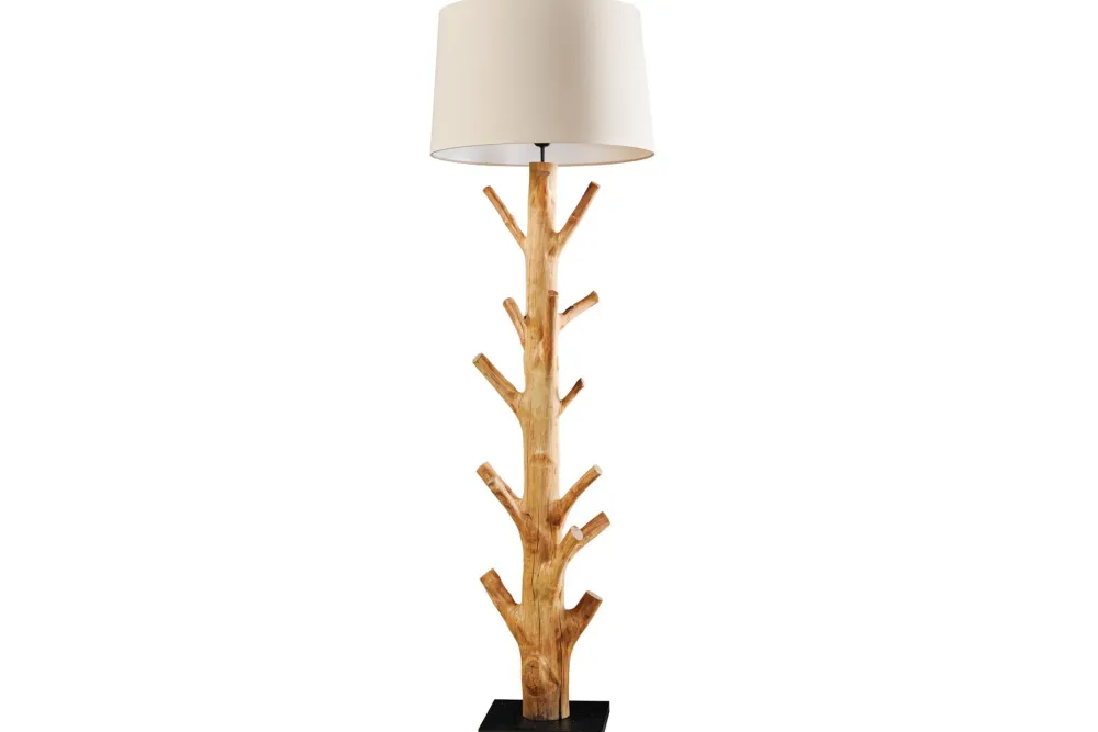 Moderne Stehleuchte aus Mangostan-Holz und Leinen in Natur und Beige