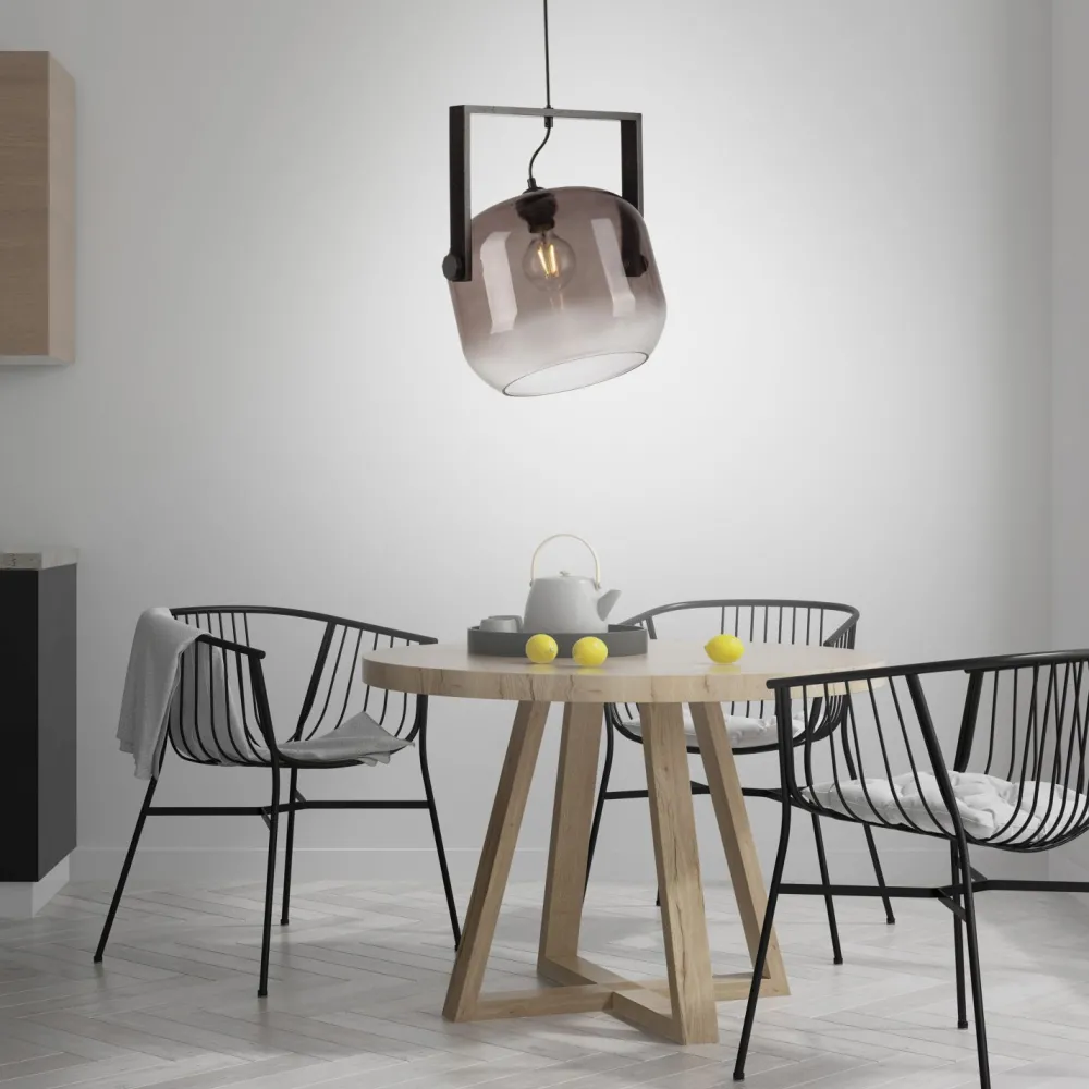 Der getönte Glasschirm streut das Licht blendarm für ein wohnliches Ambiente in Wohnzimmer und Esszimmer über dem Esstisch