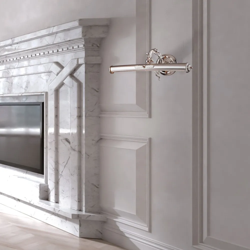 Die kunstvoll verzierte Wandlampe setzt Bilder, Gemälde und Andenken dank der verstellbaren Lichtrichtung gekonnt in Szene