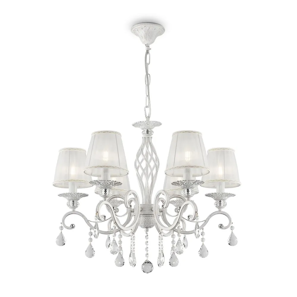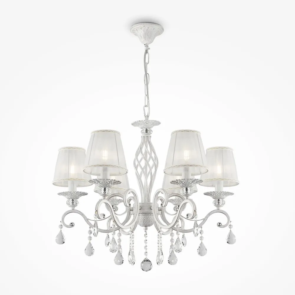 Die zarten Lampenschirme und die funkelnden Kristalle verleihen der Pendelleuchte einen romantischen Look – ein echter Hingucker in jedem Raum