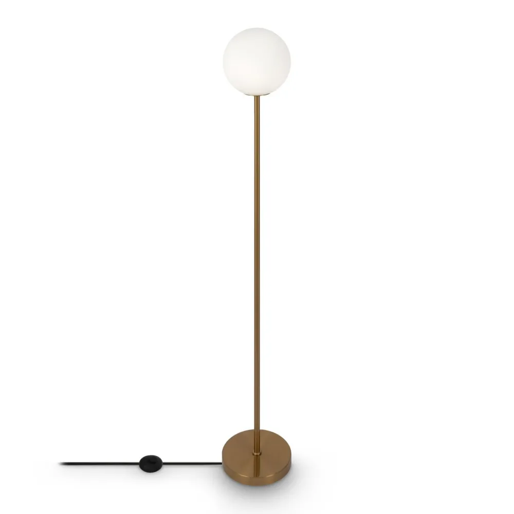 Der Kugelschirm aus Glas sorgt für eine blendarme Lichtstreuung – ideal neben dem Sofa