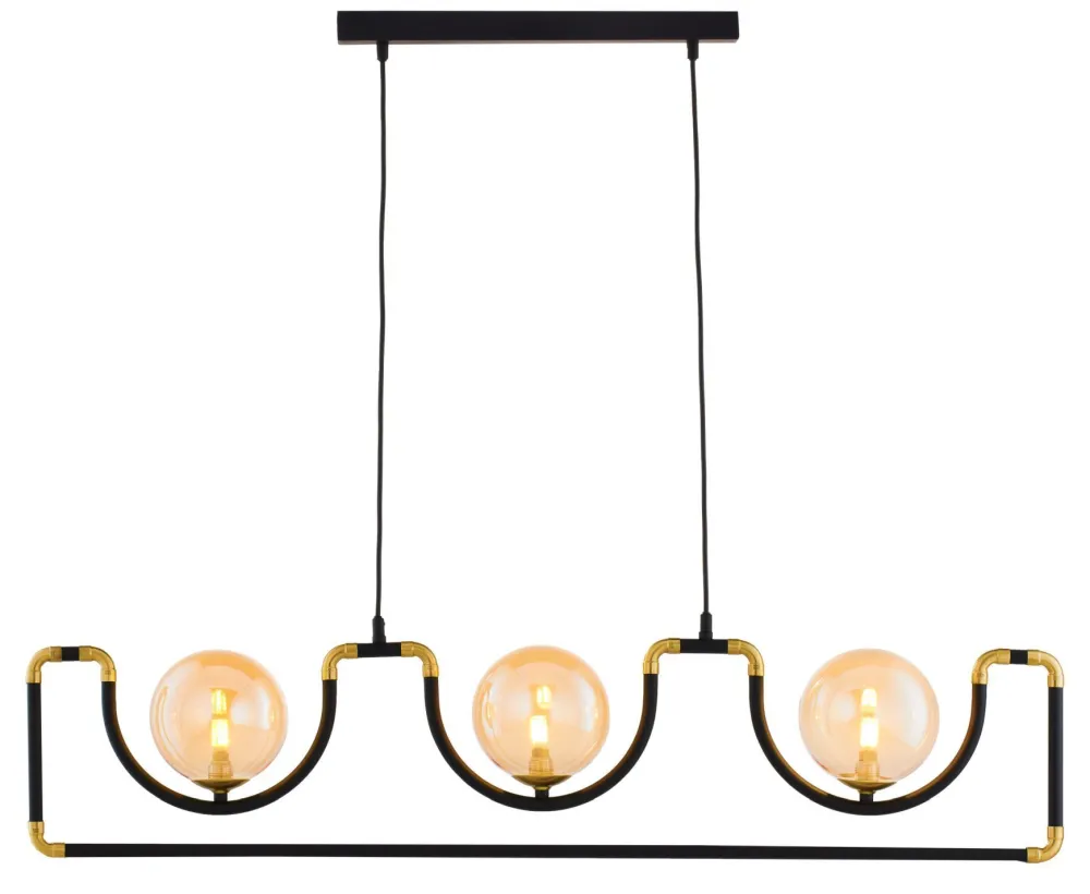 Moderne Pendelleuchte aus Metall und Glas in Schwarz, Bernstein und Gold
