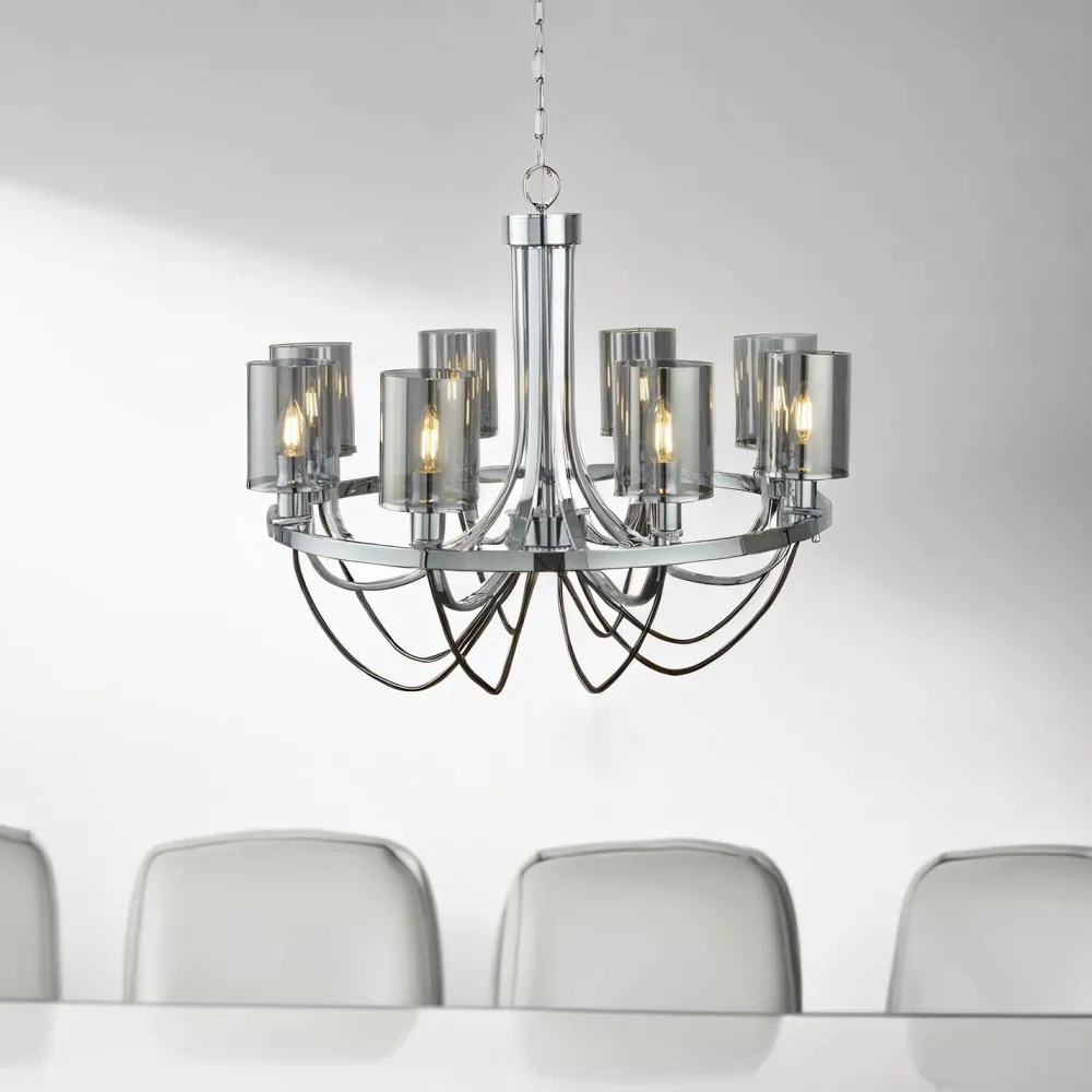 Moderner Kronleuchter mit Glas Schirm in Chrom und Grau