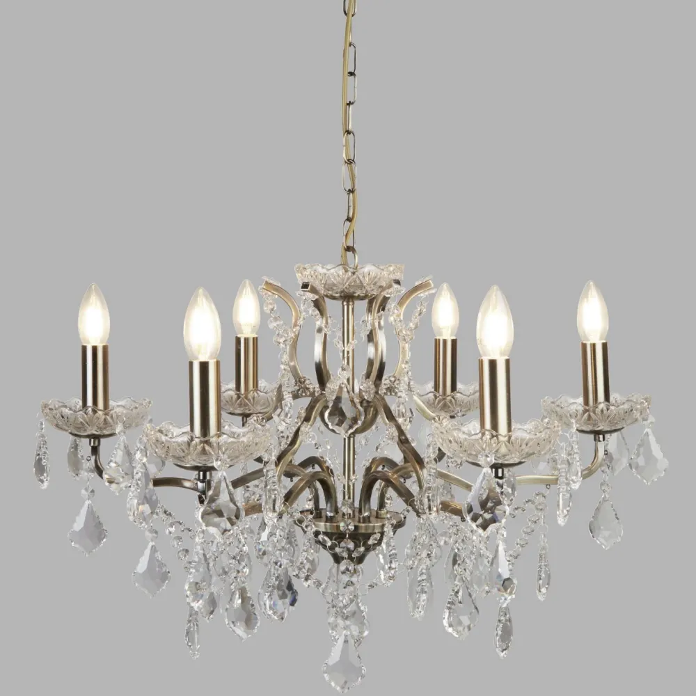 Der opulente Lüster besticht durch seine floralen Verzierungen und funkelnde Glaskristalle – ein dekoratives Highlight in jedem Schlafzimmer, Wohnzimmer und Esszimmer