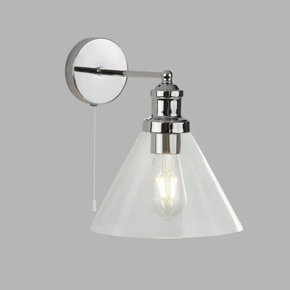 Mit stilvollem Zugschalter direkt an der Wandleuchte zum bequemen Ein- und Ausschalten – ideal für Bad, Küche und Arbeitszimmer