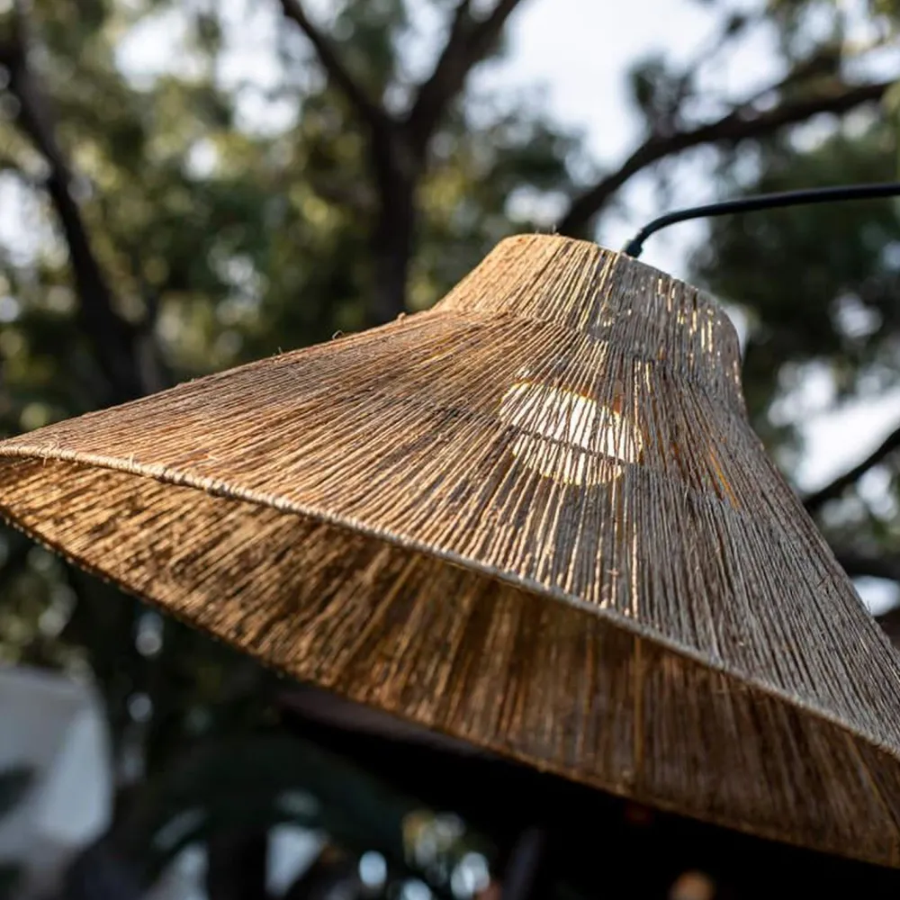 Multifunktionale Außenleuchte mit wohnlichem Lampenschirm aus geflochtenem Seegras und smartem Leuchtmittel