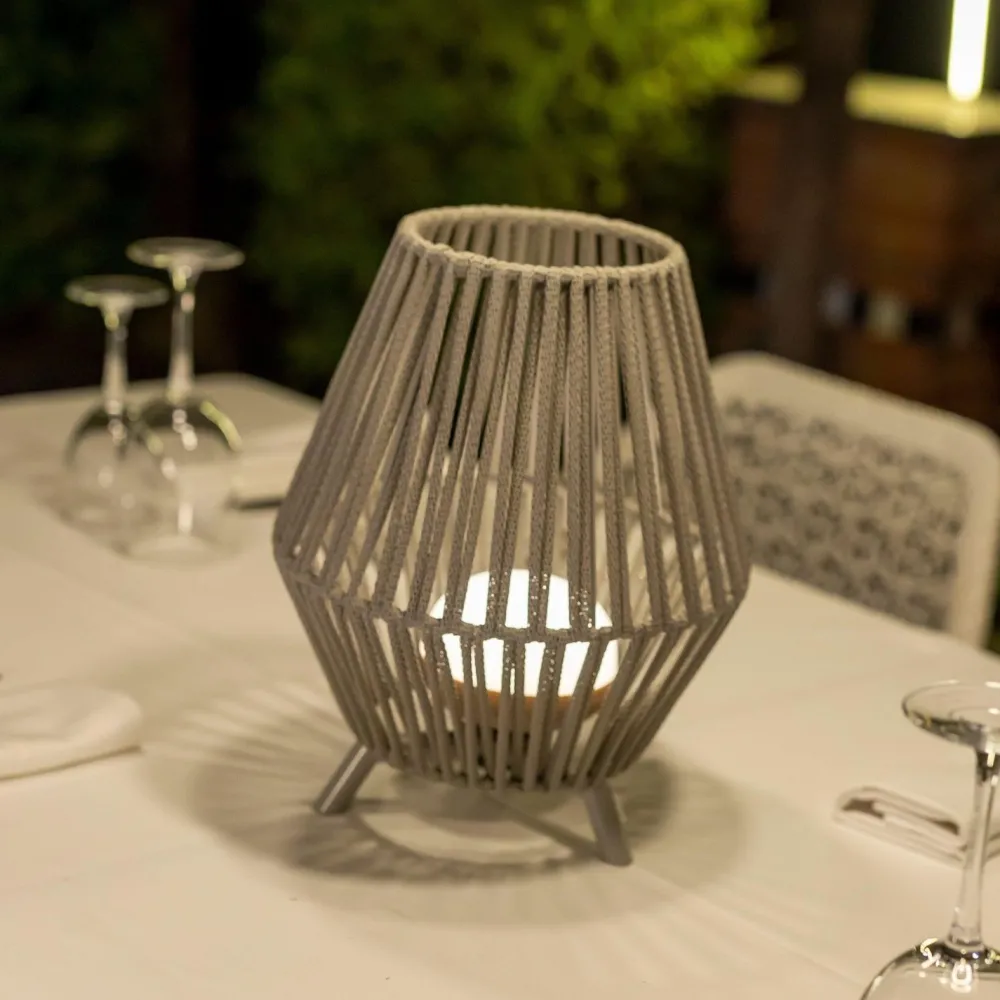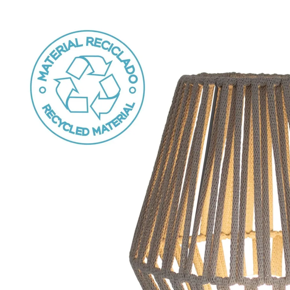 Kabellose Tischleuchte für außen mit besonderem Lampenschirm aus recycelten Kunststofffasern