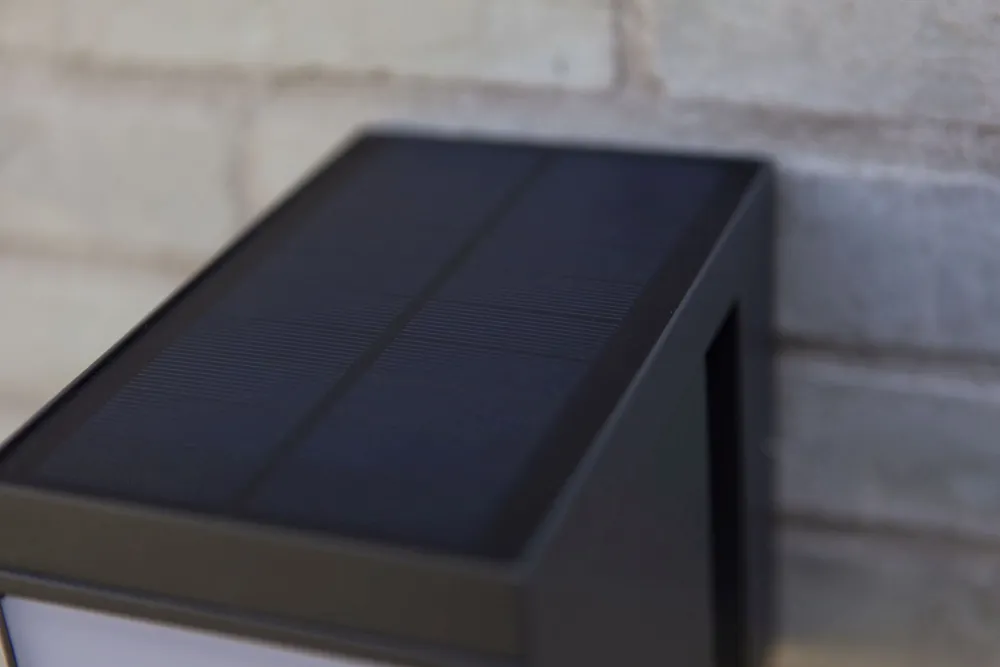 Das Solarpanel befindet sich an der Oberseite der Wandleuchte und speichert Licht nachhaltig durch Sonnenergie