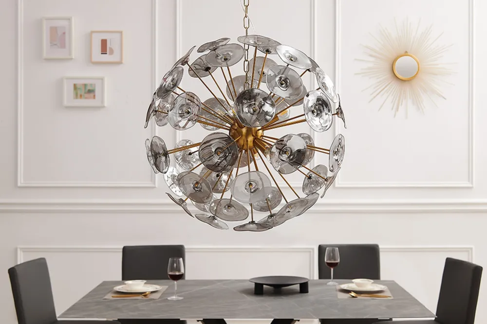 Durch die 48 Glasscheiben der Pendelleuchte entsteht ein einzigartiger Lichteffekt – ideal über dem Esstisch in Esszimmer und Wohnzimmer