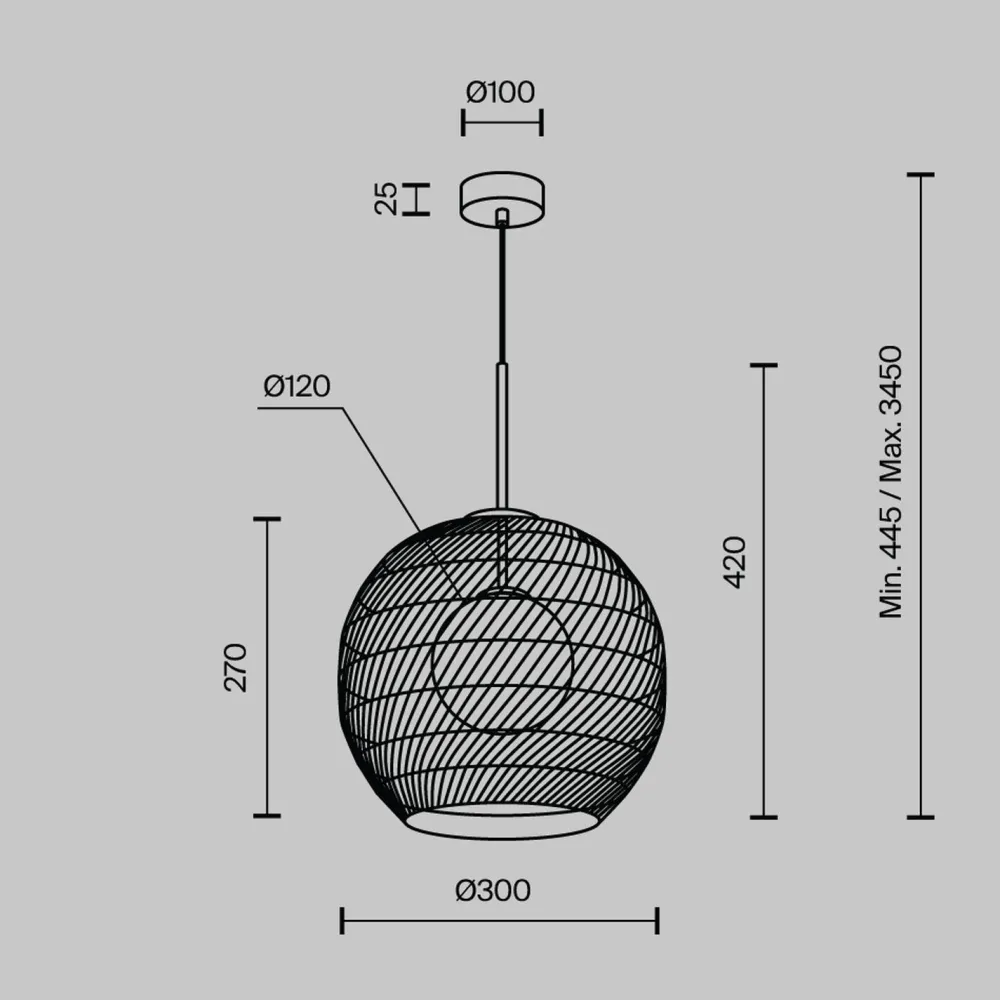 | Maße: | Breite: 300 mm | Hängetiefe: 550-3450 mm | Länge: 300 mm | Durchmesser: 300 mm | Durchmesser Sockel/Wandhalterung: 100 mm |