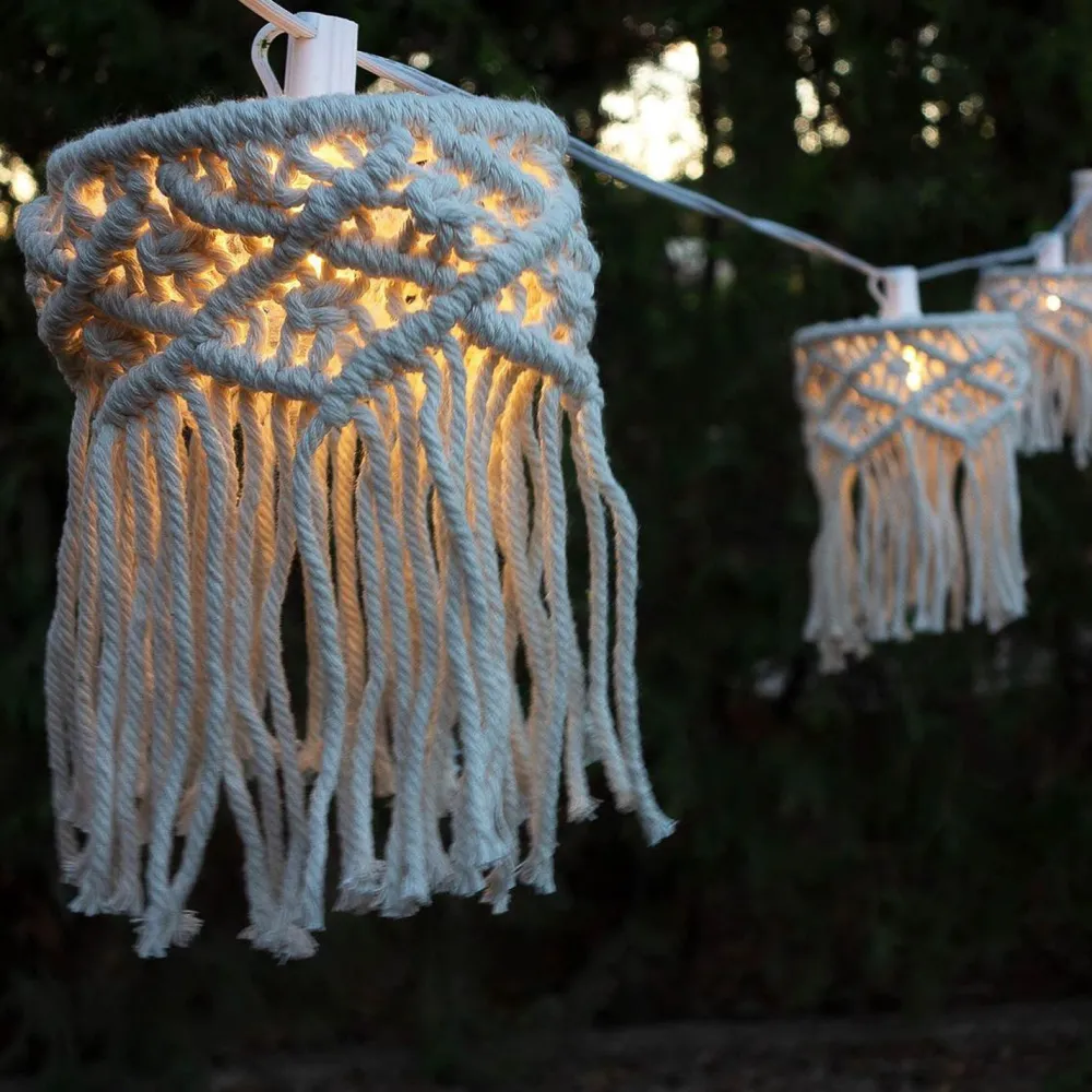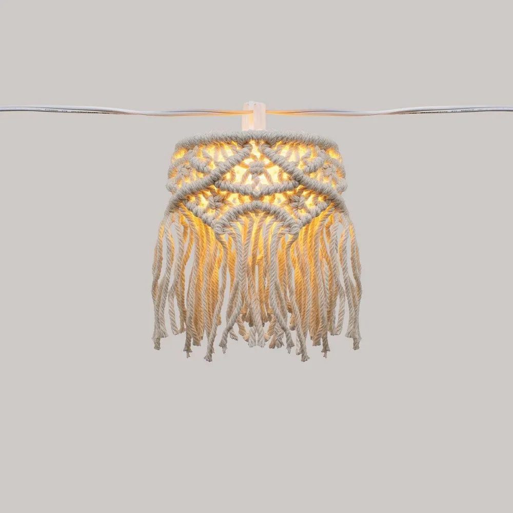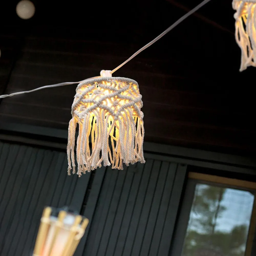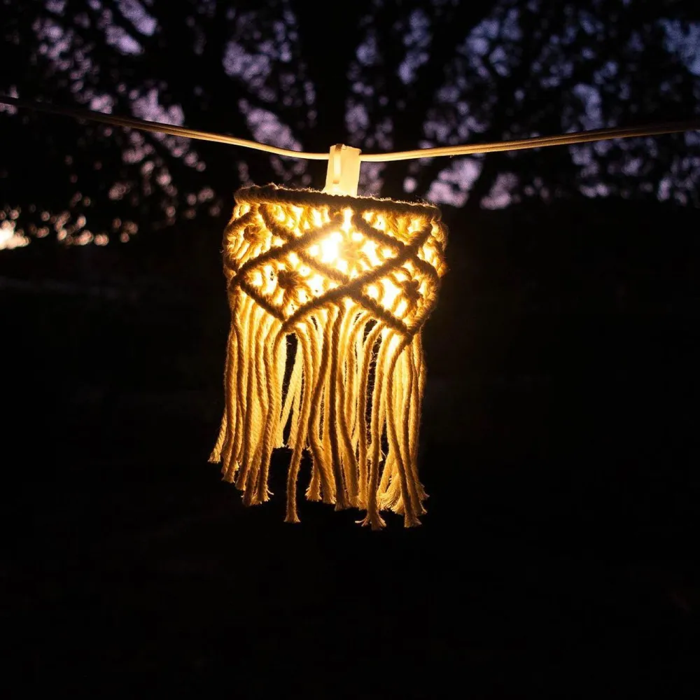 Multifunktionale Außenlichterkette mit dekorativen Lampenschirmen aus geflochtener Baumwolle