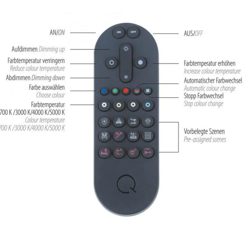 Bedienung über mitgelieferte Infrarot-Fernbedienung (auch per Smartphone und Sprachsteuerung, zb. Alexa, Google Home und Zigbee)