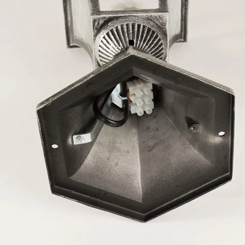 Die Lampe besteht aus witterungsbeständigem Aluminiumguss und robustem Glas